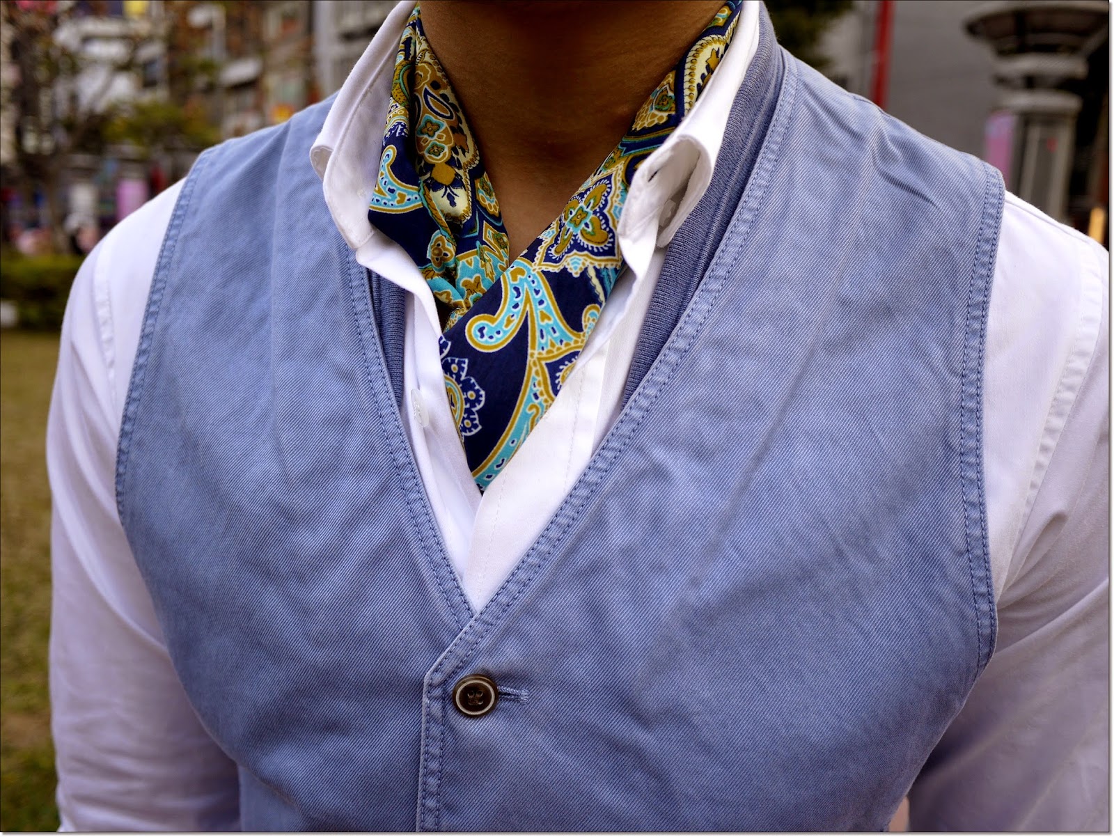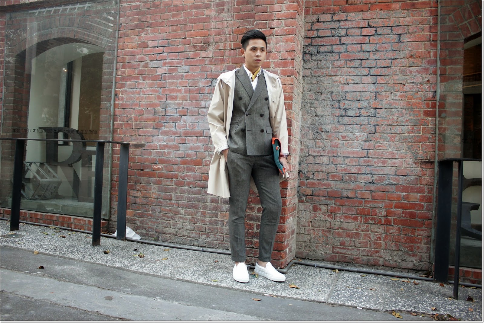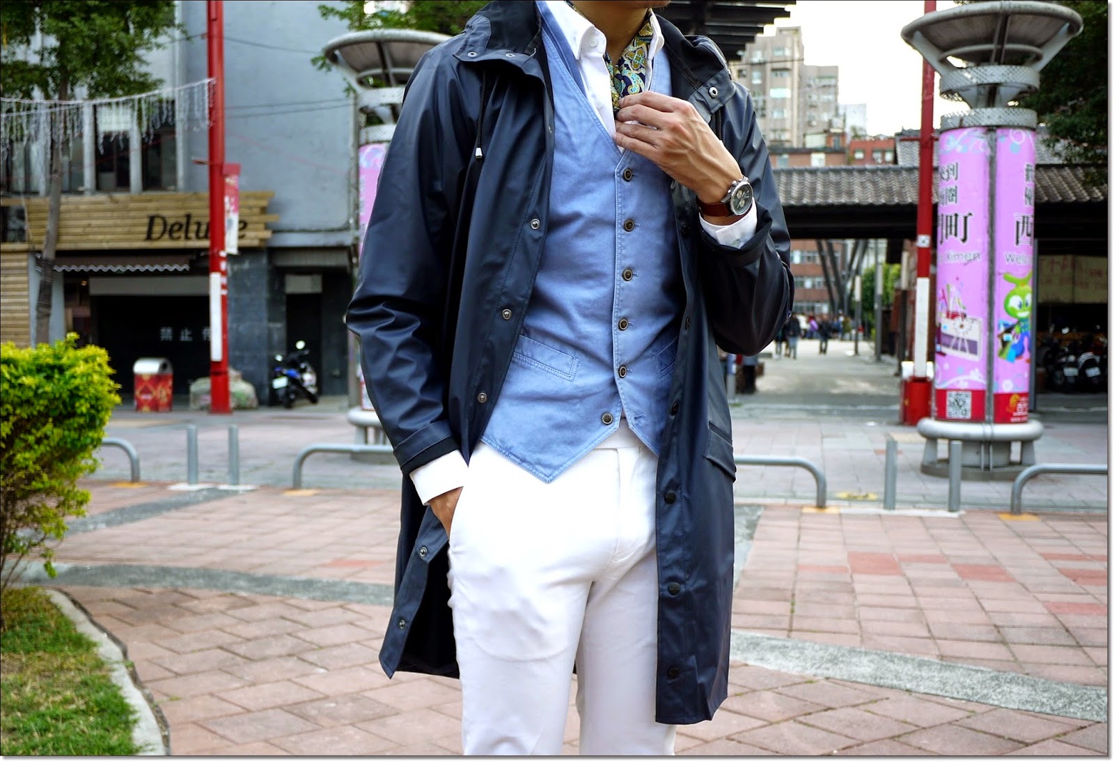 同色系的穿著不但容易(大部分人都會對單一顏色特別喜好,小學幼稚園交換問卷都會問你喜歡什麼顏色),且通常效果出眾,他不但能加強你原本的風格,且也會讓穿著多了個主題與特色。這邊簡單給予穿著同色系的建議就是:盡量挑選不同材質作組合,如這套的背心(棉)、領巾(絲)、Loafer(麂皮)及雨衣(橡膠),把握這個原則你將可以一直很出色地穿著自己心愛的顏色。
