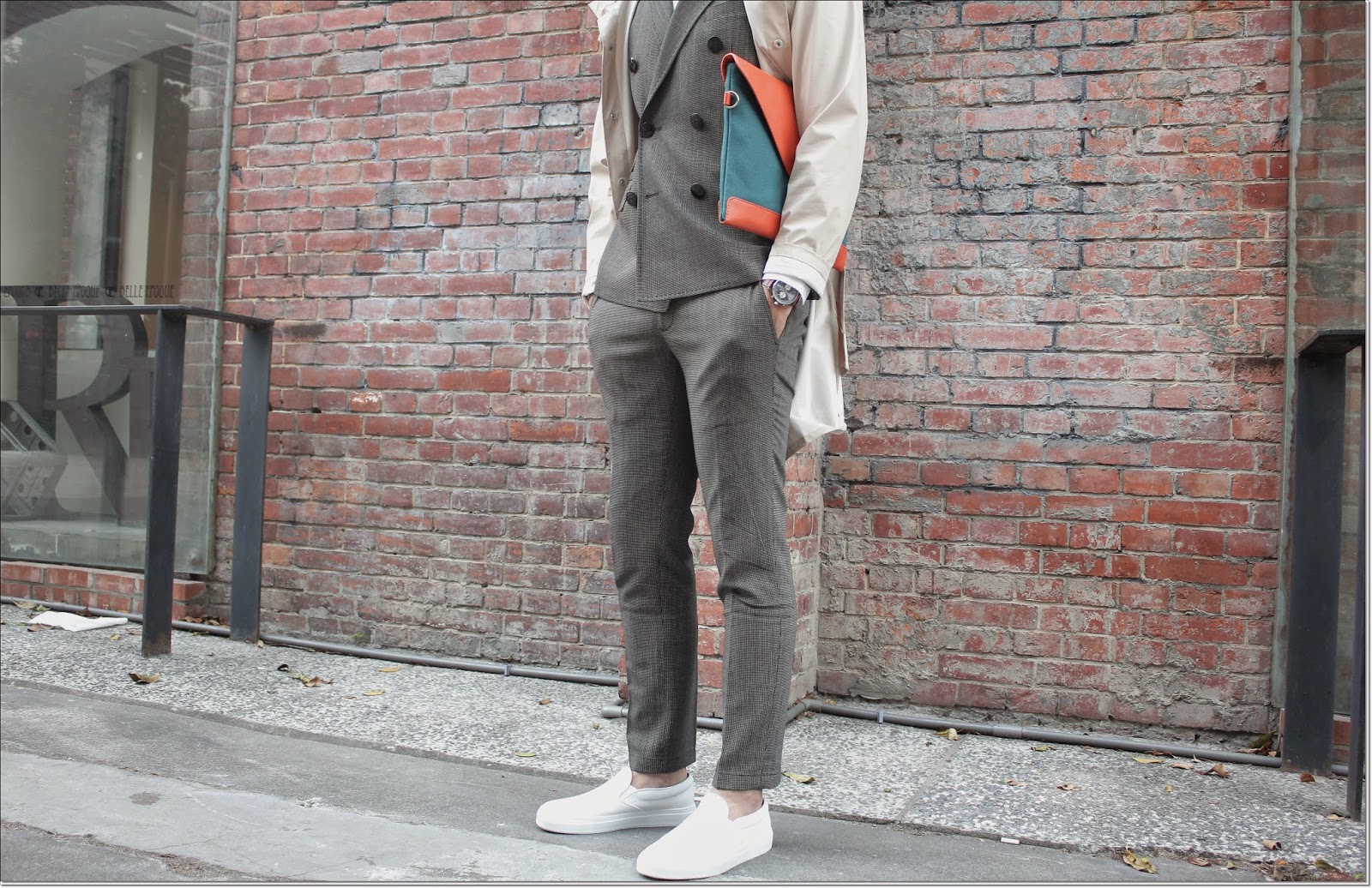 因為沒有穿皮鞋跟打領帶了,正式感不足的部分直接用成套西裝拉回,配色上對應春天所以較為明亮,白鞋跟手拿包大概是近年時裝週上最常被提及的東西(白鞋可能還包含潮流雜誌網站都會一直提),黃色領巾則是一個脖子上畫龍點睛的層次,淺灰雙排西裝不分季節都是塑造紳士感的好幫手,裡面只穿一件素T時我也很愛這麼穿。