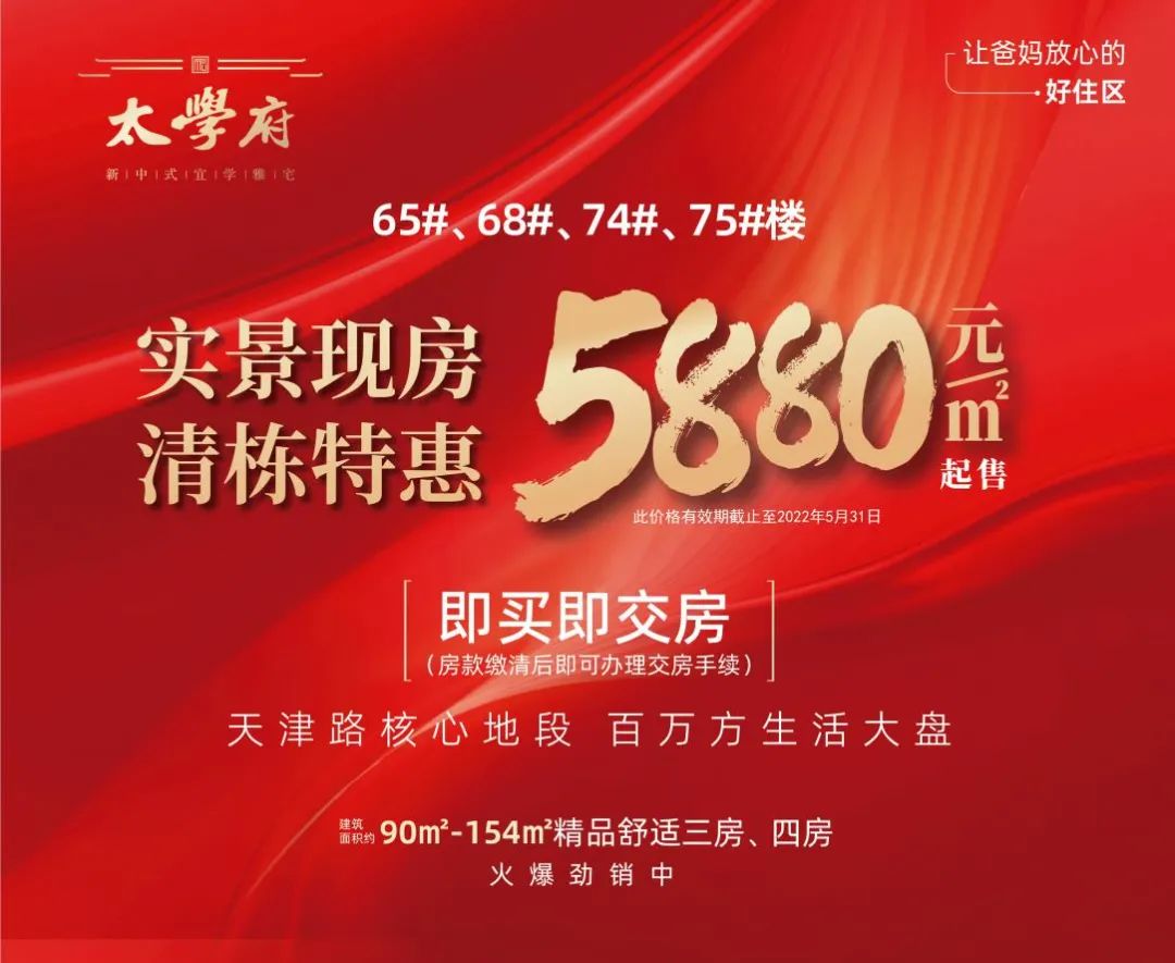 实景现房,清栋特惠,太学府65、68、74、75#楼5880元/起售(此单价有效截止日期2022.5.31),臻品席位,敬请把握!