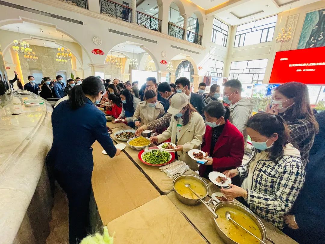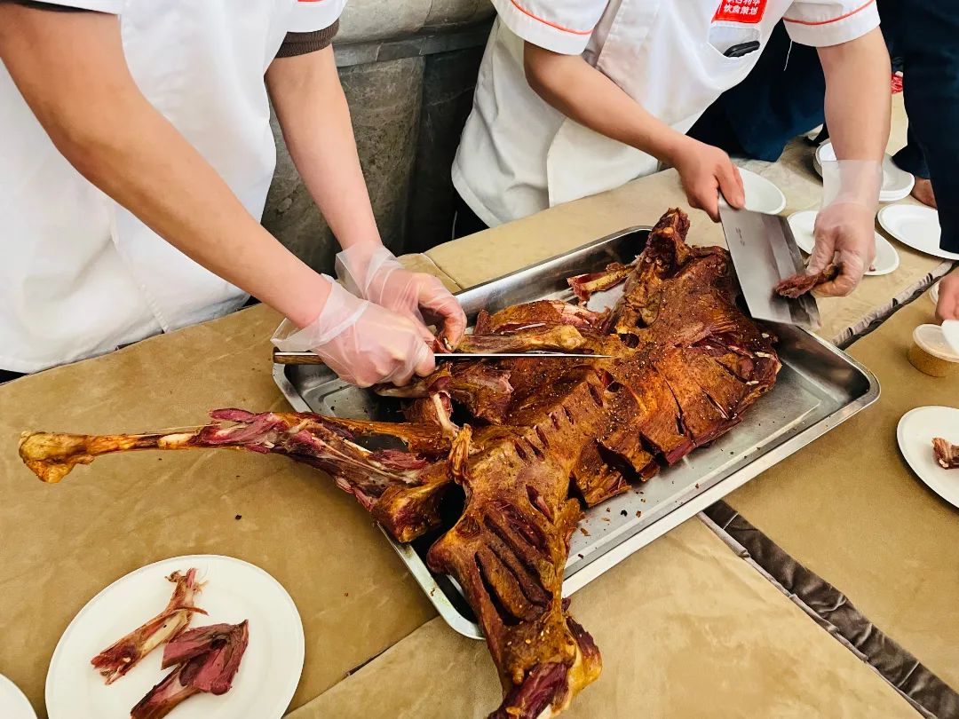在万众期待中,金黄油亮的烤全羊隆重登场。经过烹饪师傅的精心烤制,外表金黄油亮,肉焦黄发脆,香气瞬间扑鼻而来,不论是大人还是孩子都一边围观一边忍不住咽口水,迫不及待想要享受这美味。咬一口,外焦里嫩,酥香却不油腻,每一口羊肉都包含着筋道和鲜美,齿颊生香,回味无穷,赢得了现场宾客们的一致好评。
