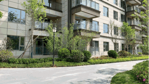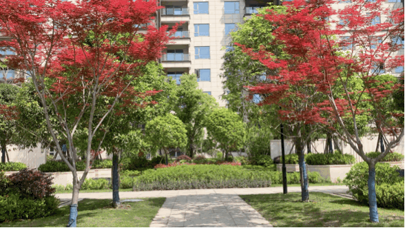 项目C区从入园开始,就做到了一步一实景,在清新的微风中体会幸福,在满眼绿意中呼吸新鲜空气,于不动声色间邂逅生活闲逸。高大乔木、簇簇灌木与草本植物相应错落搭配,一派和谐。
