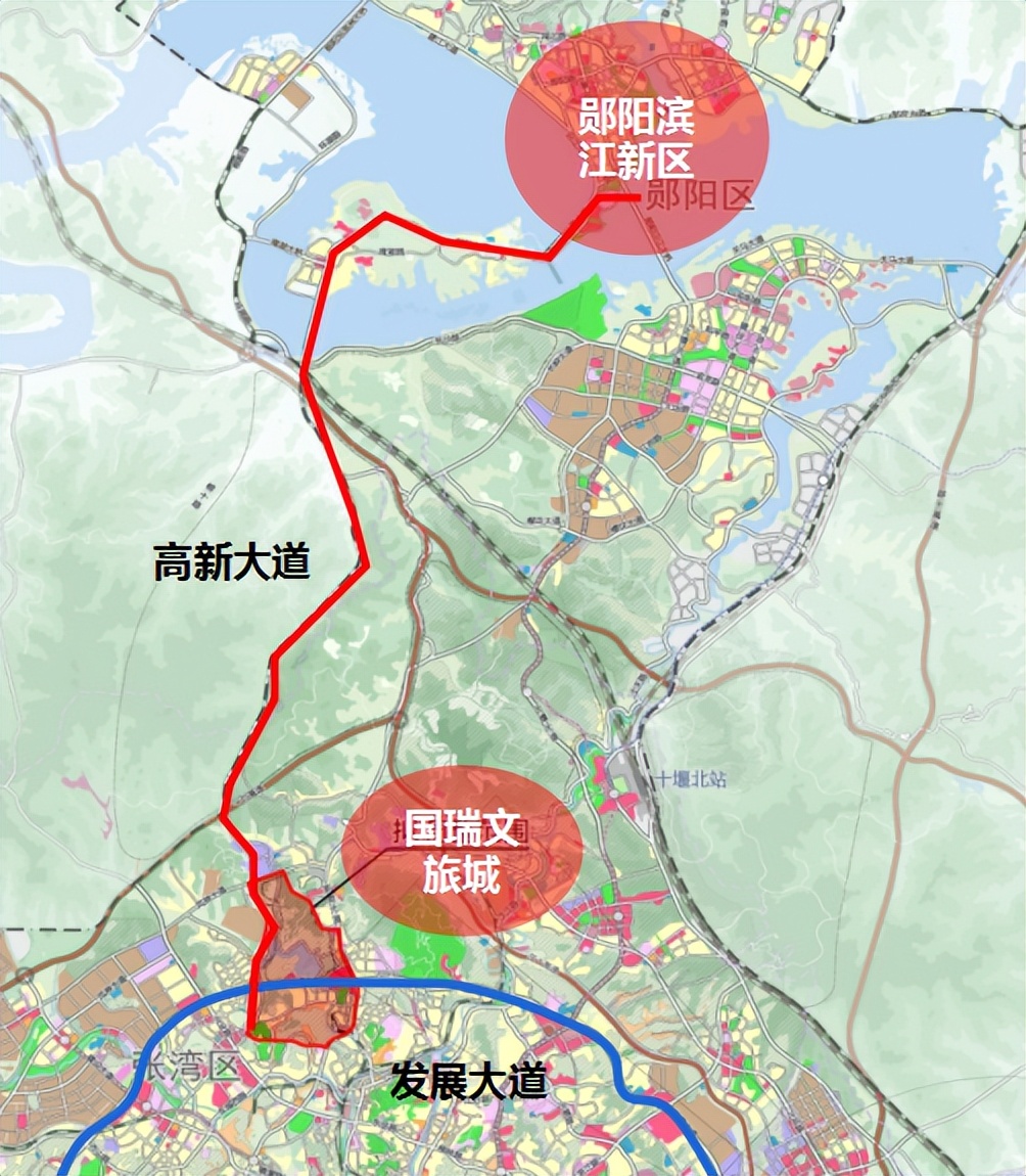 十堰市高新大道是最新规划建设的一条连接十堰中心城区和郧阳区的高标准一级道路,全长18.24公里,由中心城区段和郧阳段两部分组成,与发展大道叶湾隧道西端附近相连,其中中心城区段约6.1公里。
