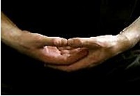 将手掌放在膝上,手掌朝上,左手掌在下,右手掌在上,两掌重叠。左手掌接触到右手的手指。两手的拇指轻轻接触。