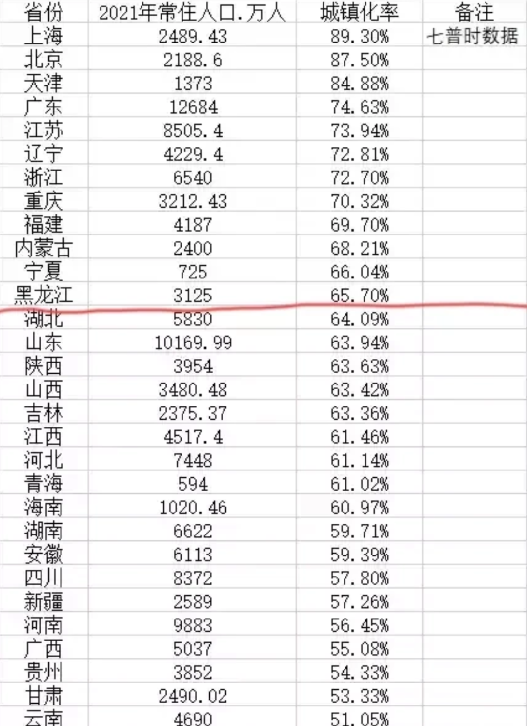 根据七普的数据,21年我国的城镇化率已经达到64.7%,12个省市城镇化率超过平均线,19个省市城镇化率在平均线以下;其中沪京津直辖市城镇化率超过84%。
