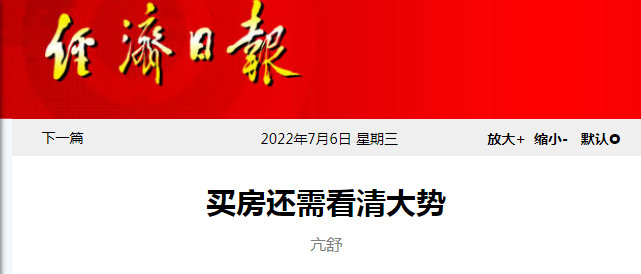 7月6日,经济日报就发表了这样的文章《买房还需看清大势》。文章站在购房者的顾虑上提到,房地产市场瞬息万变,谁又能保证买了房子以后房价不跌,一定买在最低点呢?