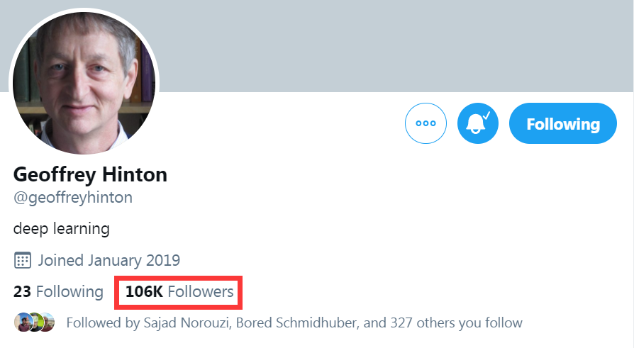 https://p3-tt.byteimg.com/origin/pgc-image/SMkPafjIrhOJ8v?from=pc点击之后发现跳转到了推特页面,这时能看到Hinton的推特粉丝数是106K。