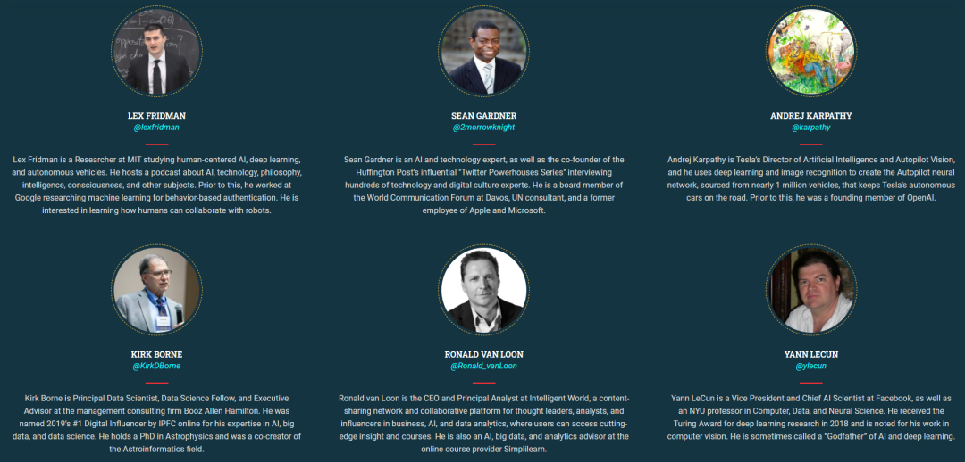 第七位的这个帅哥Lex Fridman是MIT的AI研究员,主要以深度学习和自动驾驶研究为主,他同时在做一个AI相关的播客,采访过吴恩达、马斯克等众多大佬,给他放一张大图。