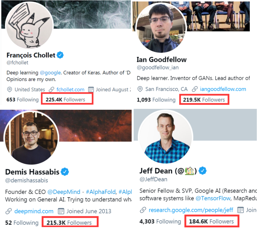 https://p1-tt.byteimg.com/origin/pgc-image/SMkPcYpHrKJ7r6?from=pc这时我突然想到了一些什么,我赶紧对比了一下上面 Francois Chollet、Ian J. Goodfellow、Demis Hassabis、Jeff Dean四人的粉丝数(因为他们四人排位很接近,但是怎么判断出谁前谁后呢)。