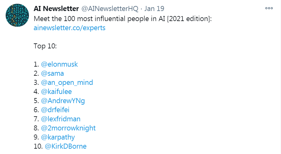 那这个榜单是不是应该叫做《推特上粉丝数最多的AI人物100人》会比较贴切一些?