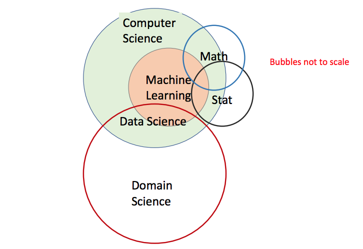 我也提出了自己的维恩图(图2) ,我相信它能更好地描述这些领域之间的关系。有计算机科学和各个其他领域的科学,数据科学就位于这些领域交叉的某些地方。机器学习是计算机科学的一个分支——是当前一个非常重要的子领域。机器学习一部分可以用于数据科学,也有很多其他和计算相关的用途。
