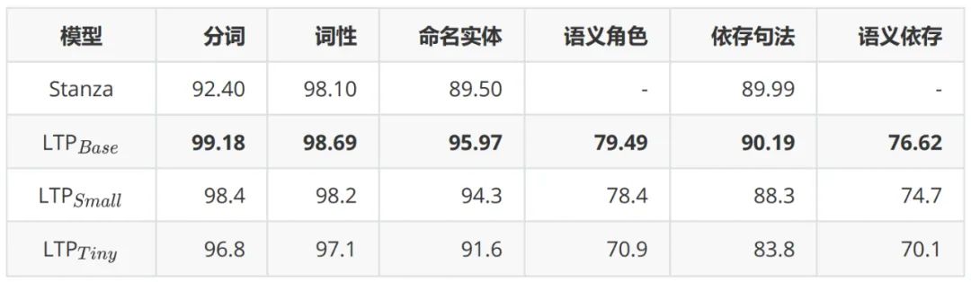 表1 LTP 和 Stanza 在 LTP 数据集上的结果。