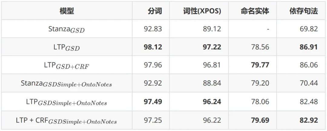 表1展示了LTP和Stanza模型在LTP数据集上的结果。