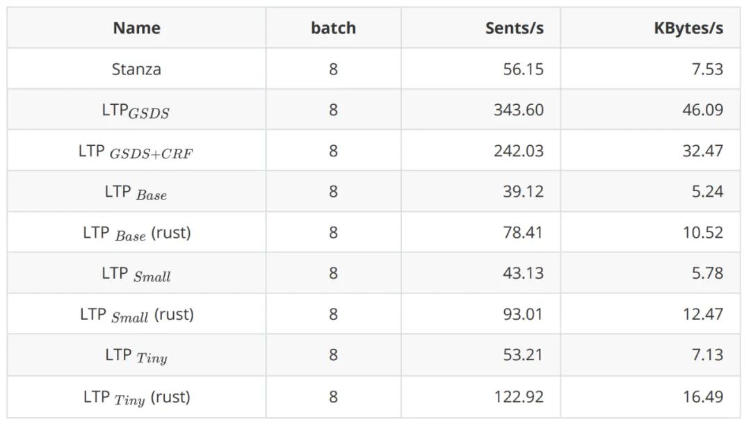 另外,我们也对模型的速度进行了比较,从表4可以看到LTP在与Stanza同样的任务量下 LTP/LTP速度是Stanza的4~6倍。另外,我们也制作了其他语言的 Binding。从表4可以看到,Rust版本相比较于Python版本快了大约两倍左右。