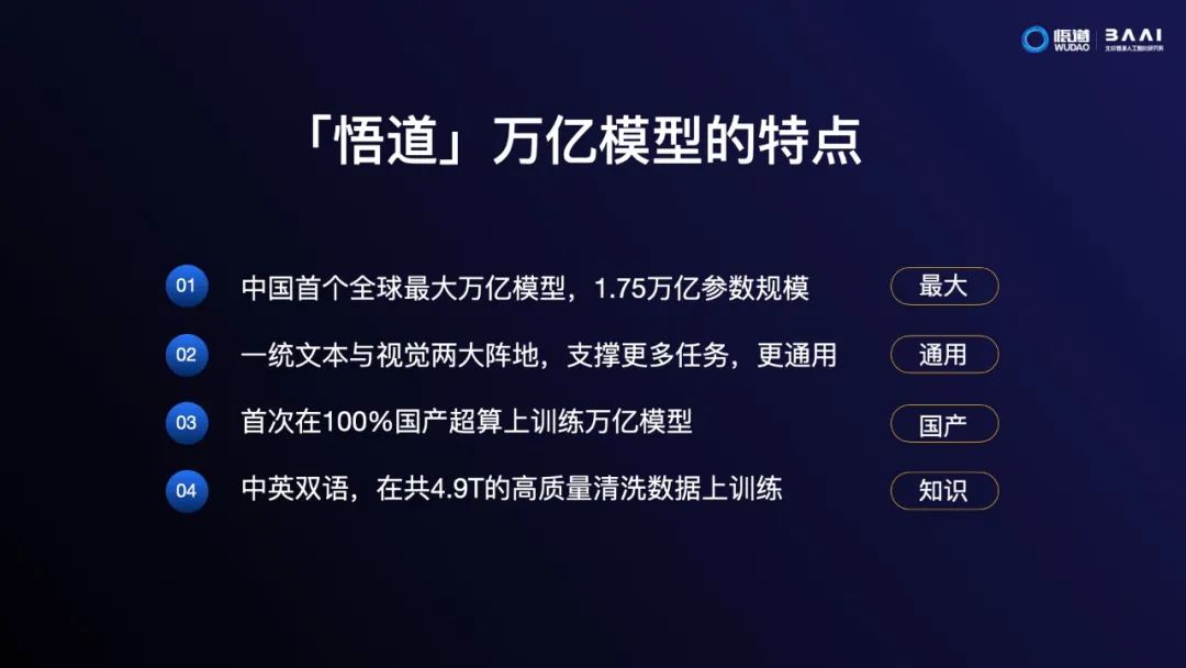 本次发布的“悟道2.0”实现了“大而聪明”,具备大规模、高精度、高效率的特点。