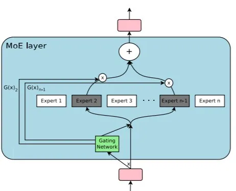 如对于每个输入,MoE动态地由门网络选择k个专家网络进行激活,一般情况下,每个输入x激活的专家网络数量都很少,如512个专家网络可能只挑选两个。在运算量(FLOPs)不变的情况下,这有利于增加模型参数量。