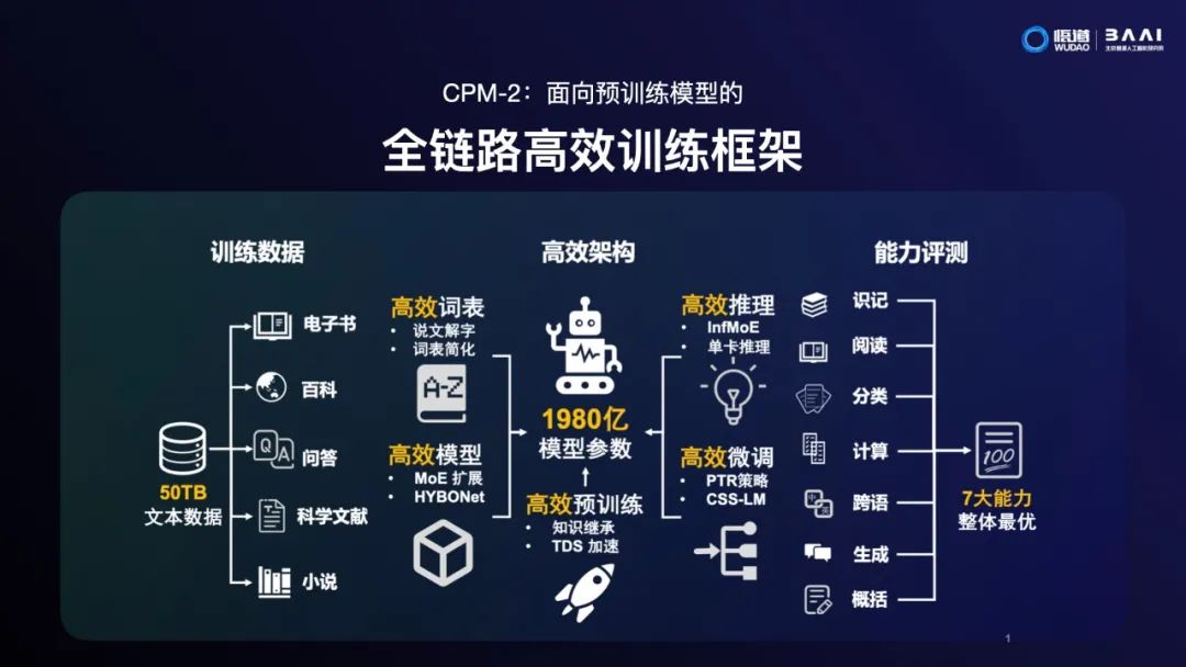 为了提高超大规模预训练模型的精度和效率,悟道2.0从模型、训练、微调、推理等环节对算法进行了全链路升级: