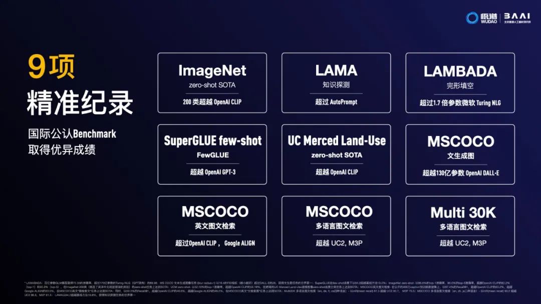 https://p3-tt.byteimg.com/origin/pgc-image/SZ5Mk2iAvmr0D3?from=pc与悟道1.0相比,“悟道2.0”不仅在模型规模上实现了万亿级参数的跨越,还在世界公认的9项 Benchmark 上达到了世界第一,在多项基准测试中超越OpenAI GPT-3、DALL·E以及Google ALIGN等先进模型。
