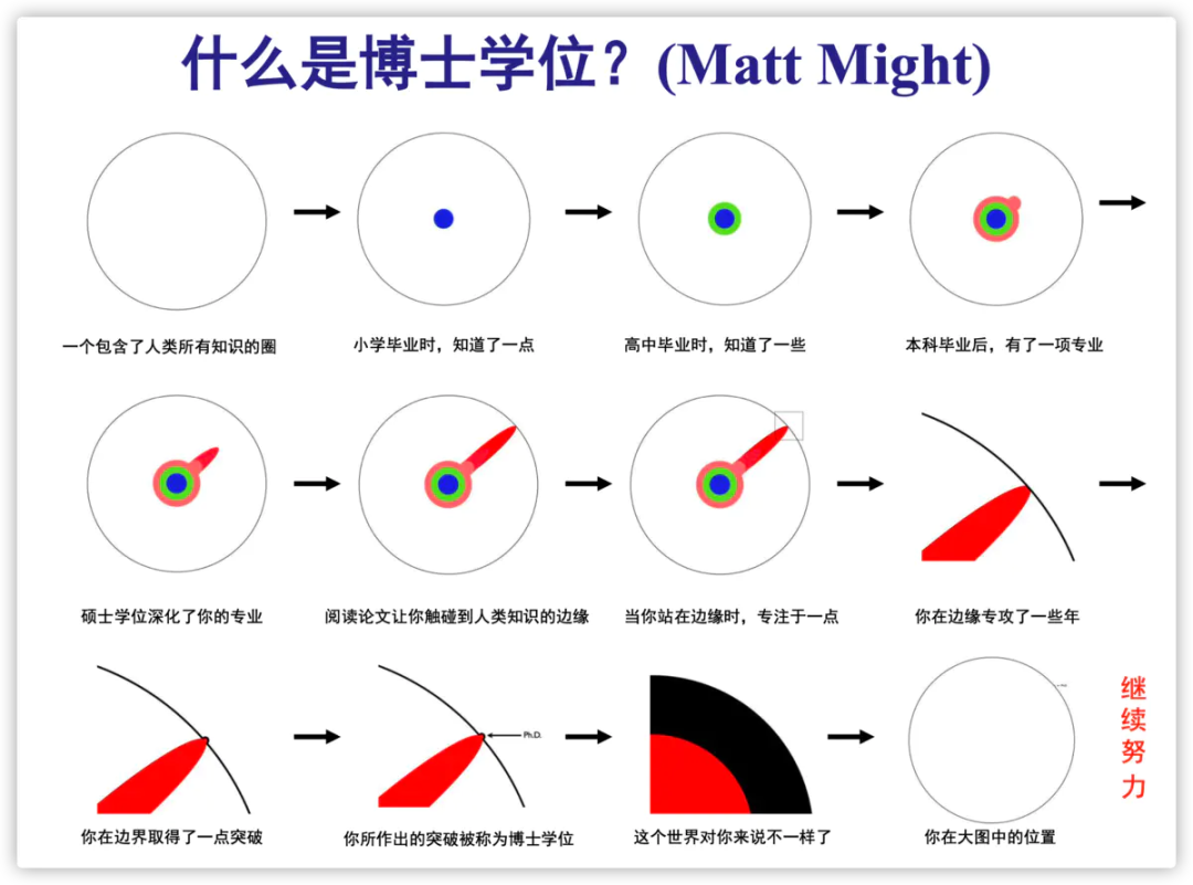关于第二个问题,不仅仅是AI研究,怎么样的博士生才是合格的呢?正如网上流传广泛的那张图,一个圈最后突出来的点就是博士为推动科研边界拓展所做的贡献。博士毕业,意味着你在自己从事的这个小方向上的理解应该比导师还细致。