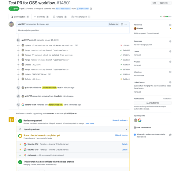 完成本地更改并通过测试验证后,用户可以在 keras-team/keras 项目中打开并发送 PR,之后会经过一系列的测试来验证它的正确性。一旦 PR 被审查者测试和批准,PR 将被镜像到谷歌内部存储库。一旦合并到 Google 内部存储库成功完成,PR 还将被标记为已合并(merged)。这与 Tensorflow OSS 的贡献流程相同,相关示例如下图所示: