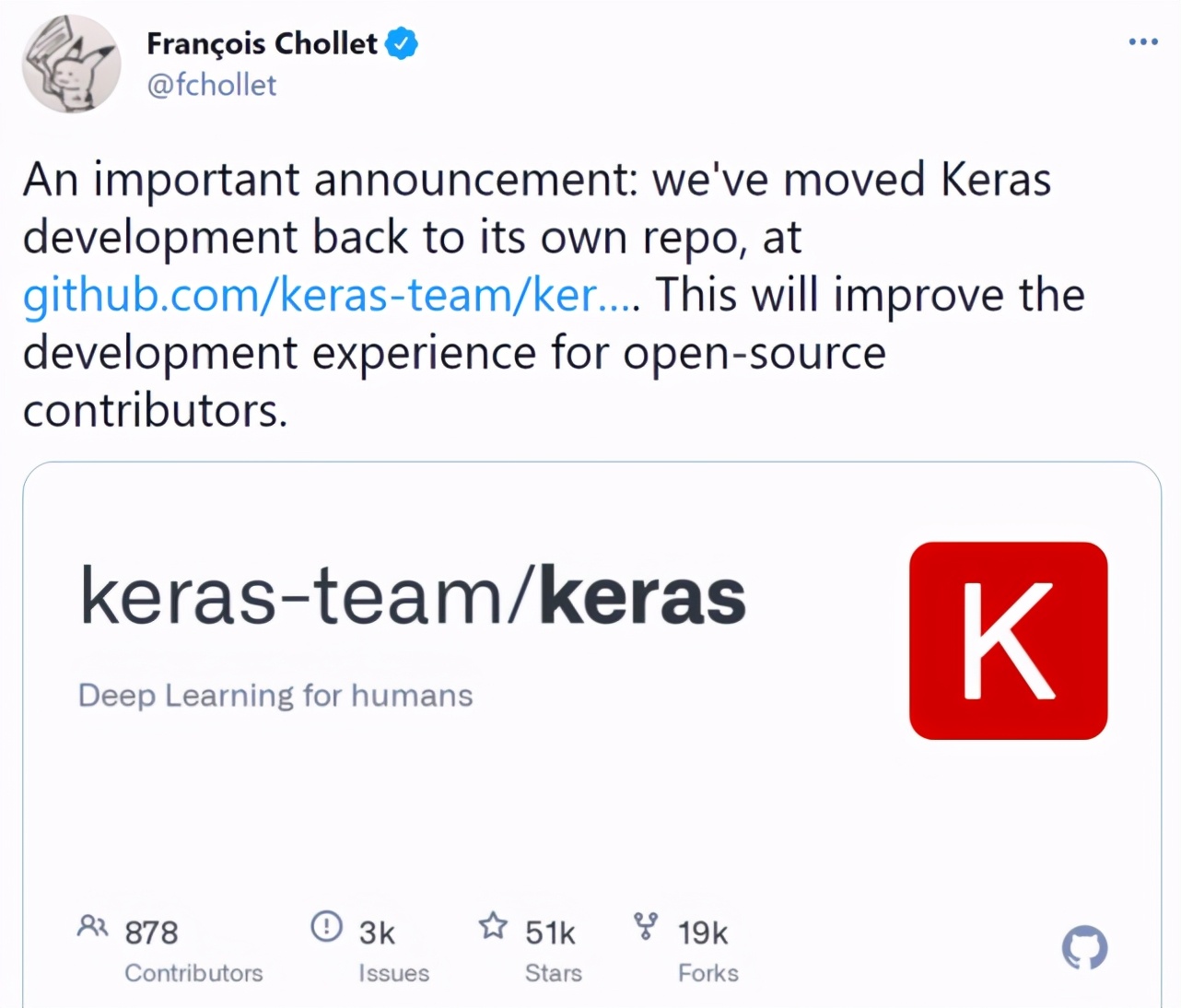 是时候做出改变了!近日,Keras 之父 Francois Chollet 在其推特宣布一项重要决定:他们已经将 Keras 的代码从 TensorFlow 代码库中分离出来,移回到了自己的 repo。