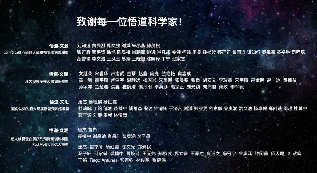 在悟道2.0的发布会上,所有参与者的名字都被列了出来。来源:智源研究院