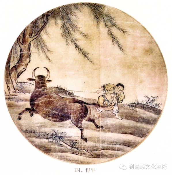 牧牛圖是借用牧人馴牛的經過,來表現佛門弟子調伏心意的禪觀修證過程。“牧牛”比喻“治心”,即將牧童比作人,將“牛”比作“心”,或是將牧童比作“心”,而將牛比作“性”,以十牛比作修心的十個階段。禪宗認為,心生則種種法生,心滅則種種法滅,本性是佛,離性別無佛。