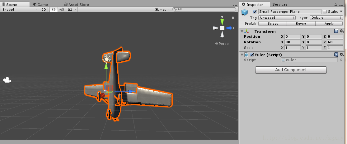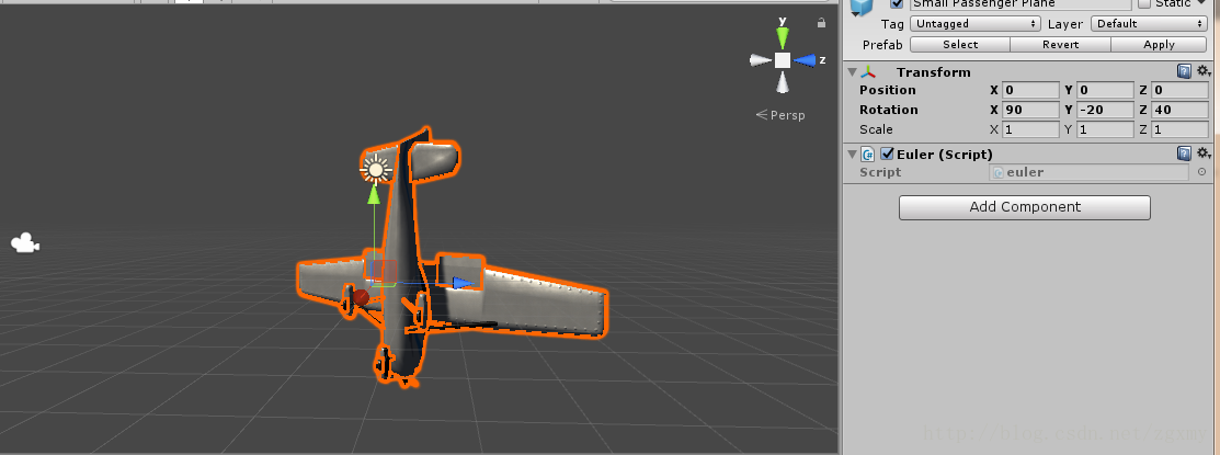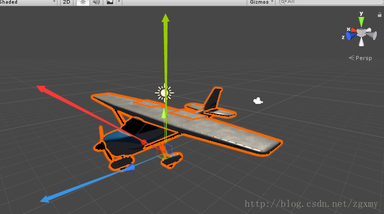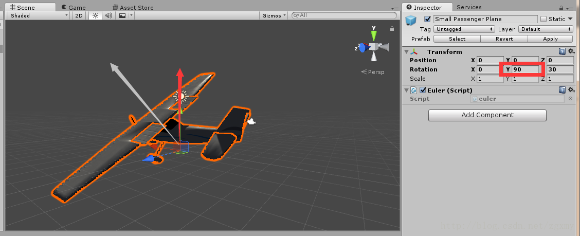旋转到(0,90,0),可以看到飞机并没有沿着旋转后的y轴(灰色箭头)旋转,仍然依照世界坐标系下的y轴(红色箭头)旋转