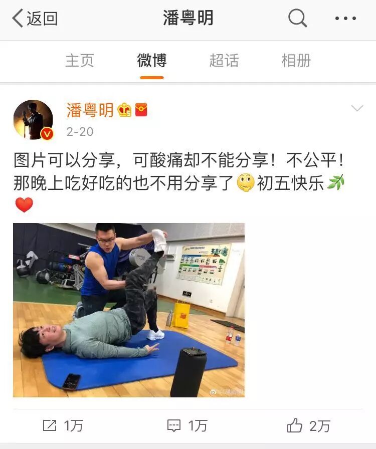潘粤明再度走红以后大家除了为他的演技打call还担心他人到中年的痛苦,那就是月半!幸好潘老师也清楚的了解到自己不能再月半下去了,所以健身!近日潘粤明在微博上晒了自己健身的照片,还说图片可以分享,可酸痛却不能分享!