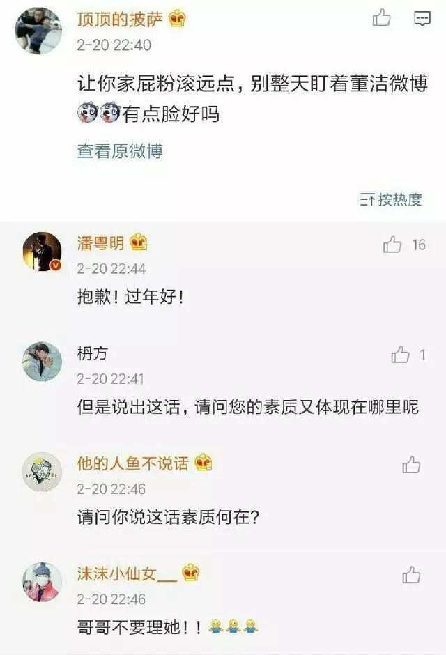 这本来只是潘老师和网友之间的日常交流,但是一个微博叫“顶顶的披萨”的网友在潘粤明微博下面留言:让你家屁粉滚远点,别整天盯着董洁微博。有点脸好吗?没想到潘粤明没有选择无视而是在这条评论下面道歉了!