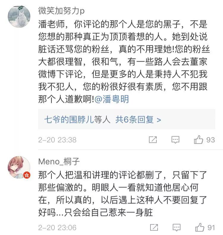 对于水军黑粉在潘粤明微博下面骂人,潘粤明的粉丝说为了怕招黑一次也没骂过,骂人的都是路人。
