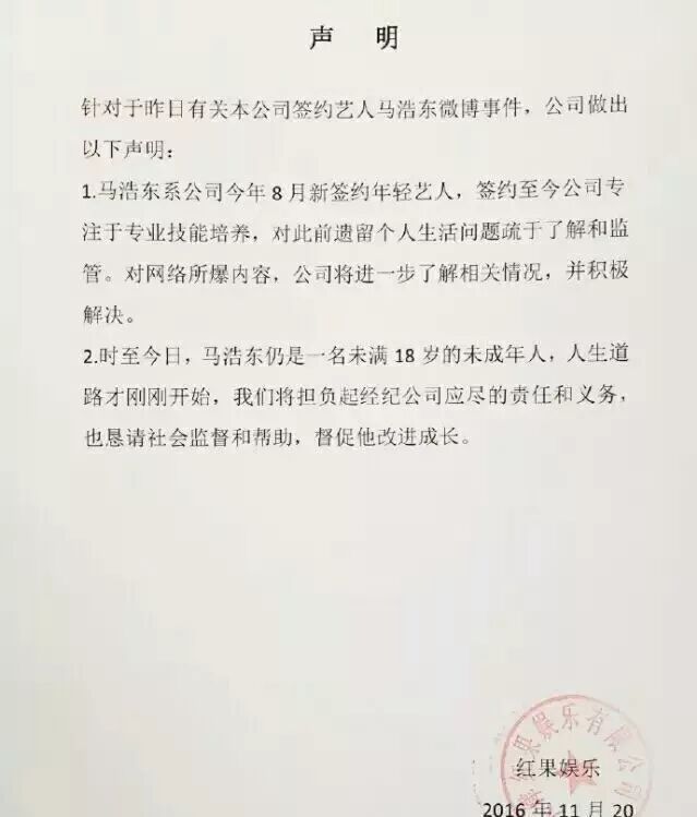 在恋爱期间,马浩东还对女友家暴,把刘胭打得伤痕累累,还出过轨。重点是当时的他18岁还未到!!!在此事之后,工作室的回应是:平时疏于管教。