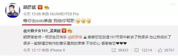 胡彦斌很快转发该微博并给予回应:“等你出solo单曲,我单独给你写歌”!