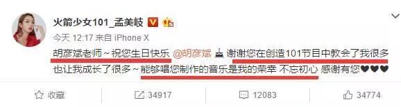 而从今天孟美岐给胡彦斌的祝福文字来看,与其说是给生日祝福,更不如说是向胡彦斌老师邀歌,她说能够唱到胡老师制作的音乐是她的荣幸。