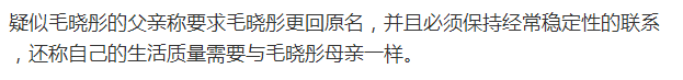 不过,有微博大号随后曝光了毛晓彤父亲与节目组导演的聊天记录,提出要求毛晓彤改回原名,必须稳定地和他保持联系,还要与母亲同等生活质量,母亲住别墅,他也要住别墅,母亲开悍马,他也要开悍马。