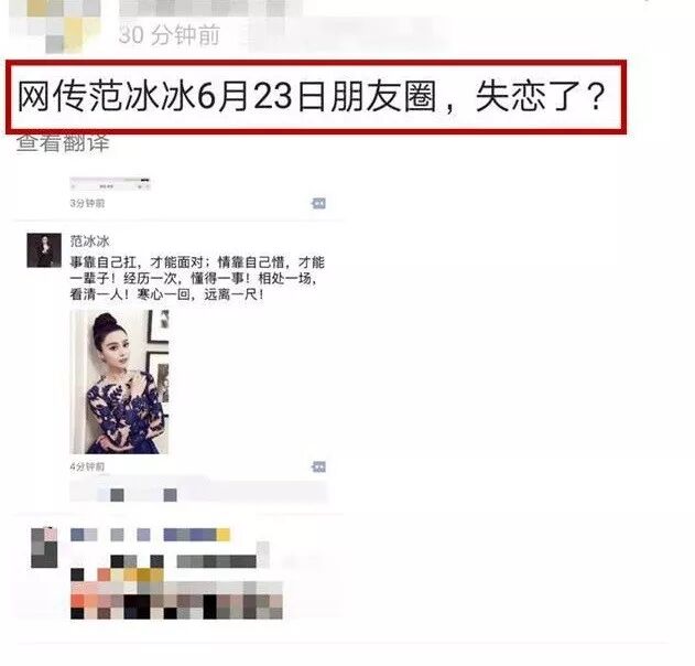最近有大V在微博曝光疑似范冰冰本人的微信朋友圈,据悉这条消息发布的时间是今年6月23日,也就是范冰冰遭遇风波之后,那个时间段范冰冰受影响很大了,因为有知情人透露《爵迹2》不能上映就是和范冰冰有关。