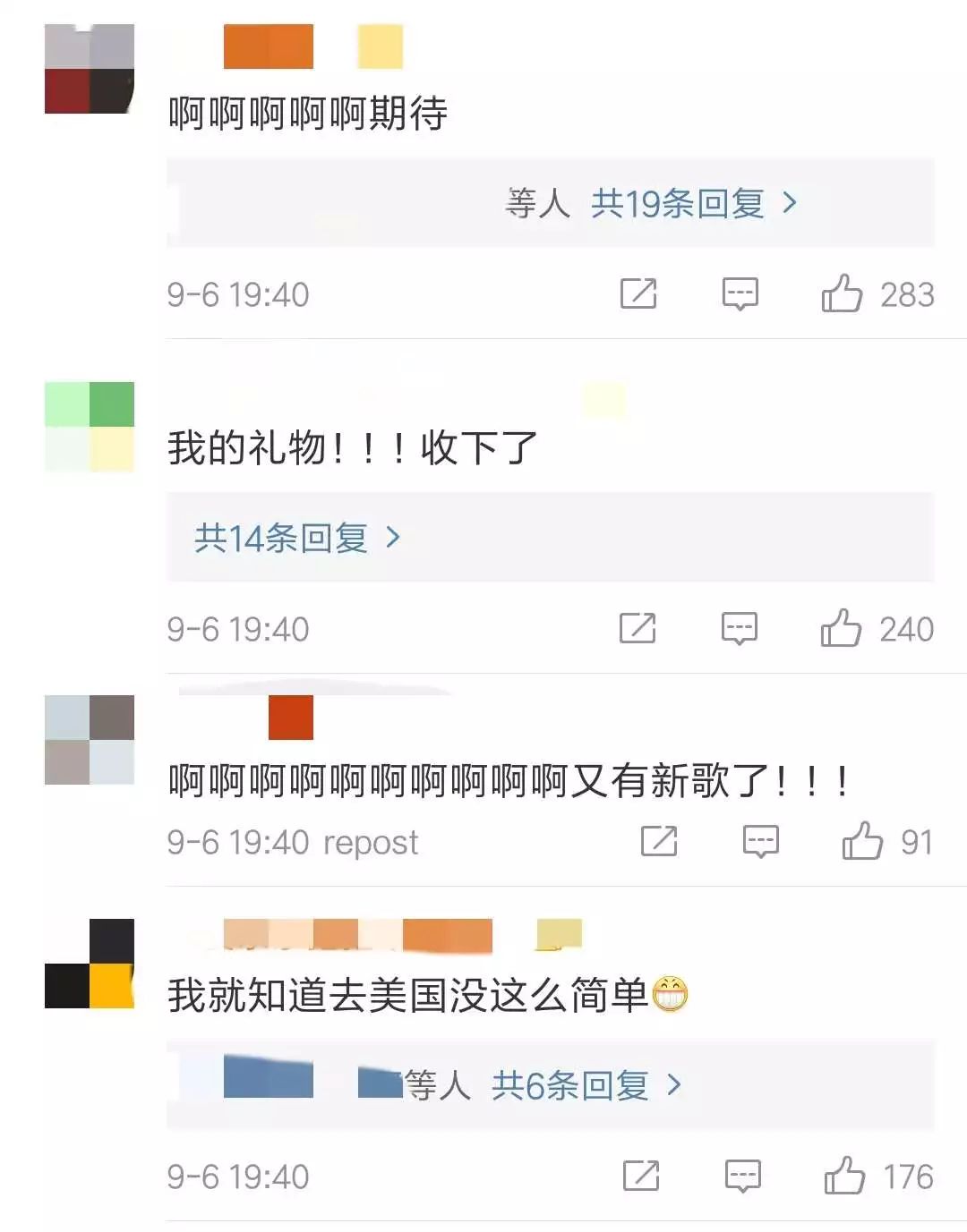 那么在工作室更新这条动态之后,粉丝们也是纷纷抑制不了自己的兴奋之情,也全都表示是特别期待这首新歌的发行。而工作室也说了这是一份给粉丝们的礼物,那么歌曲的内容会不会是与粉丝们有关的呢,粉丝们也是可以小小地期待这首歌的内容到底是不是与自己有关的了。