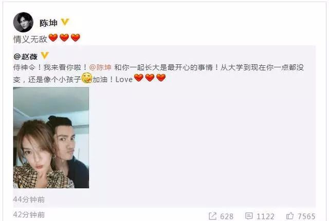9月17日晚,赵薇更新微博晒和陈坤合影,并写道:“侍神令!我来看你啦!@陈坤 和你一起长大是最开心的事情!从大学到现在你一点都没变,还是像个小孩子,加油!Love!”