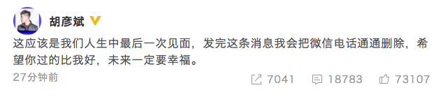 转眼胡彦斌就回应,称那是最后一次见面,并且发完微博就会把微信电话通通删除。在做客《举杯呵呵喝》的时候,聊到前任,胡彦斌也很干脆地说,不会和前任做朋友