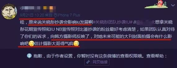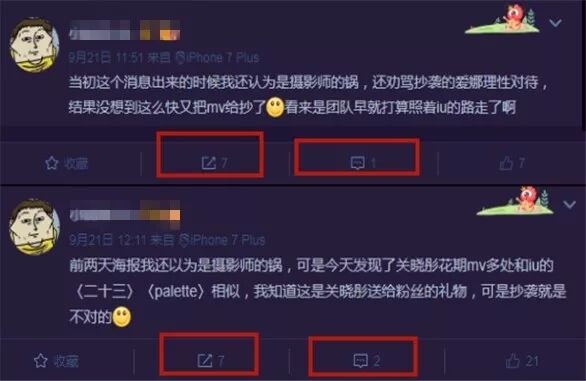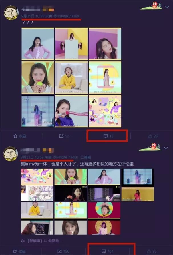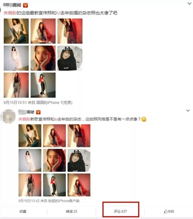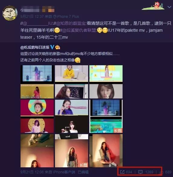 IU的粉丝在上午10点四十,发现了二者相似,并在微博上吐槽。