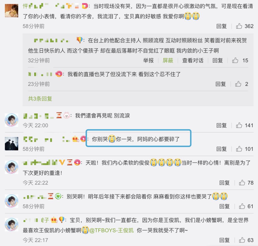 不知道落幕后,王俊凯一个人到后台会不会大哭一场!王俊凯他真的是特别温柔细腻的小孩,表面上装的再酷再皮其实心里像棉花一样柔软,会眼眶发红会偷偷瘪嘴不让自己掉眼泪,真好。但我想说,离别是为了更好的相见,别哭,我们明年见!