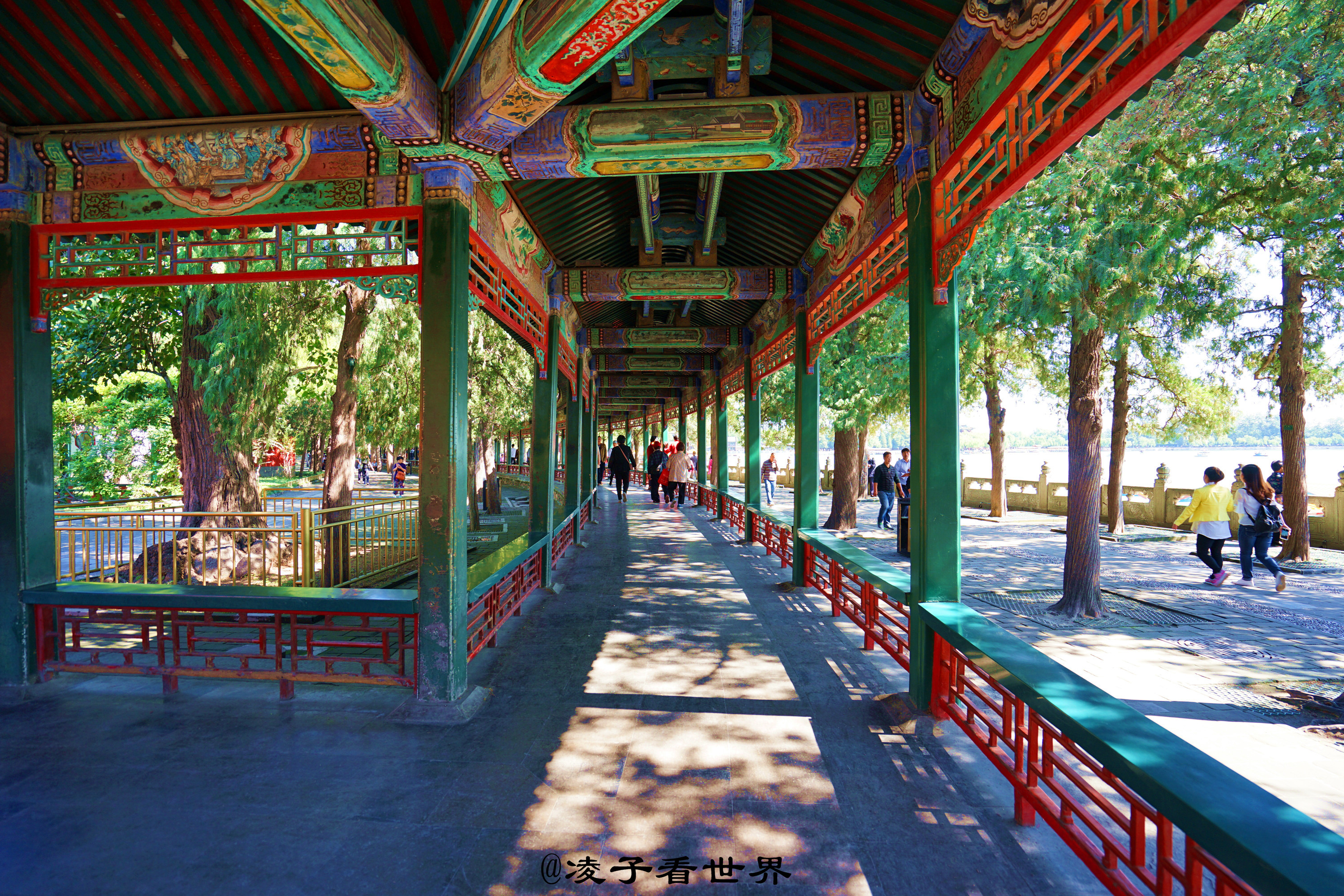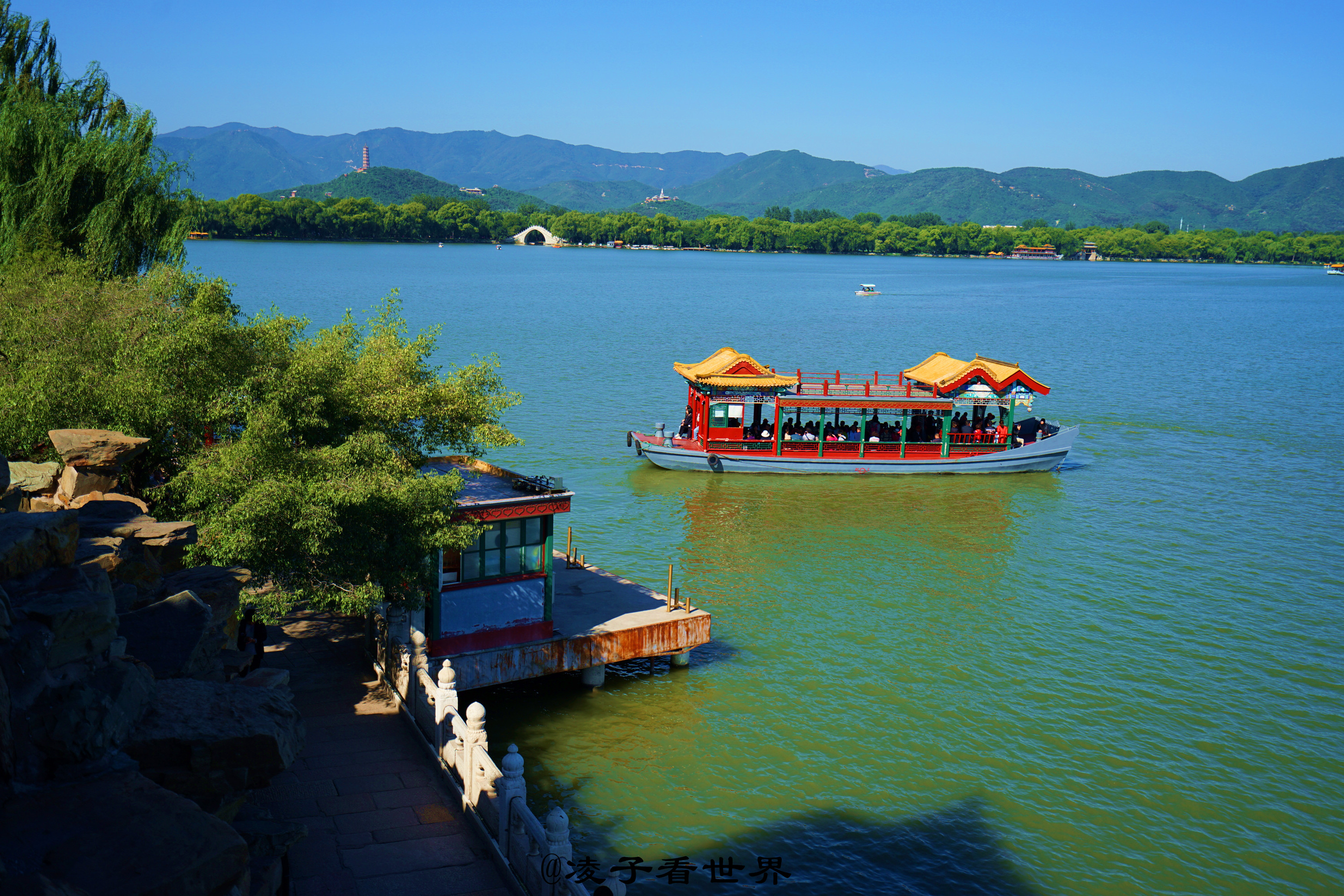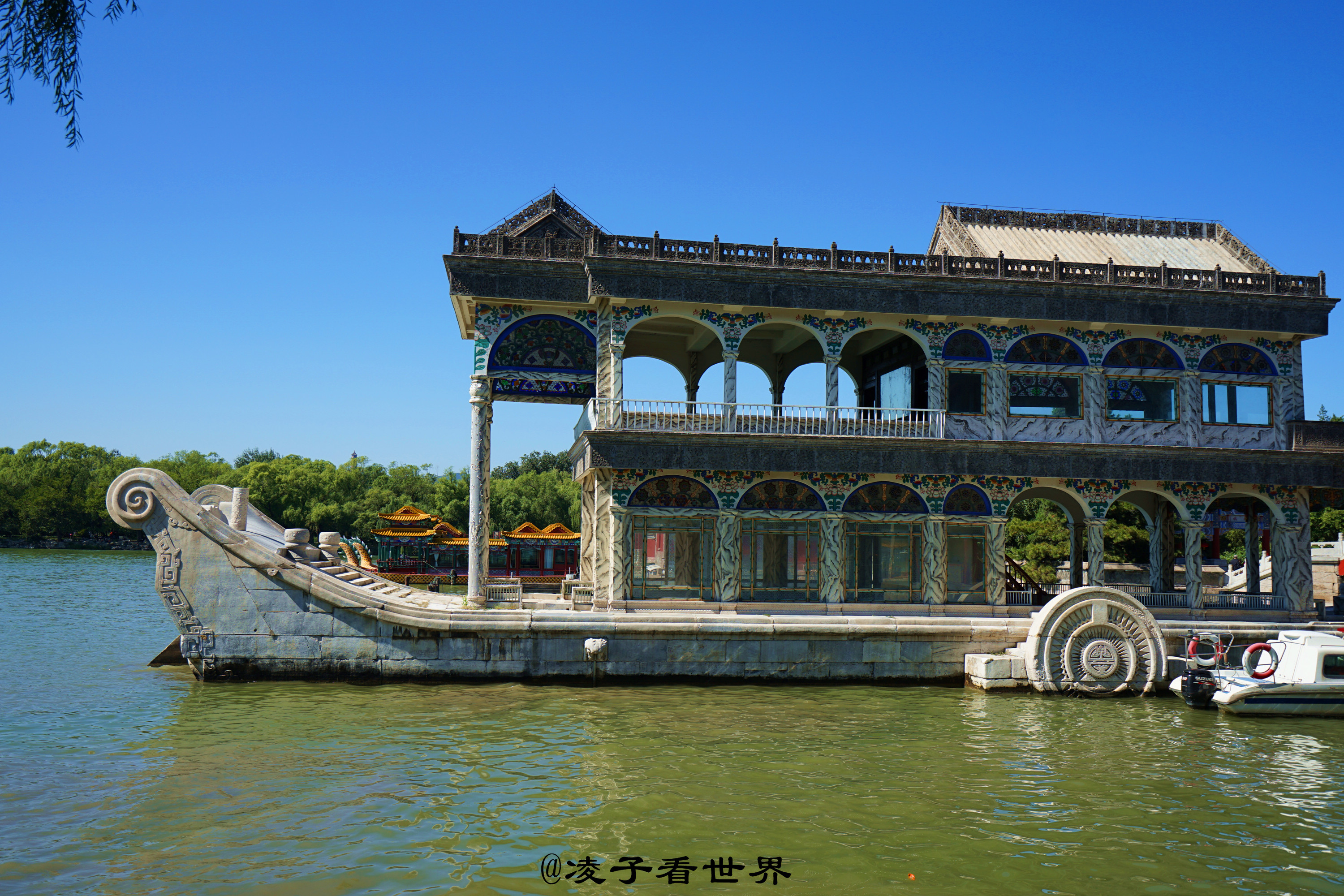 http://si1.go2yd.com/get-image/07ItUWD9ZZo颐和园十七孔桥,桥身长一百五十米,宽八米,由十七个券洞组成,是颐和园内最大的一座桥梁。远远望去像一道长虹飞跨在碧波之上。颐和园石舫,船体乃用巨石雕成,全长36米。船上二层白色木结构楼房,都用油漆装饰成大理石纹样,顶部有砖雕装饰,精巧华丽,是颐和园内著名的水上建筑珍品。