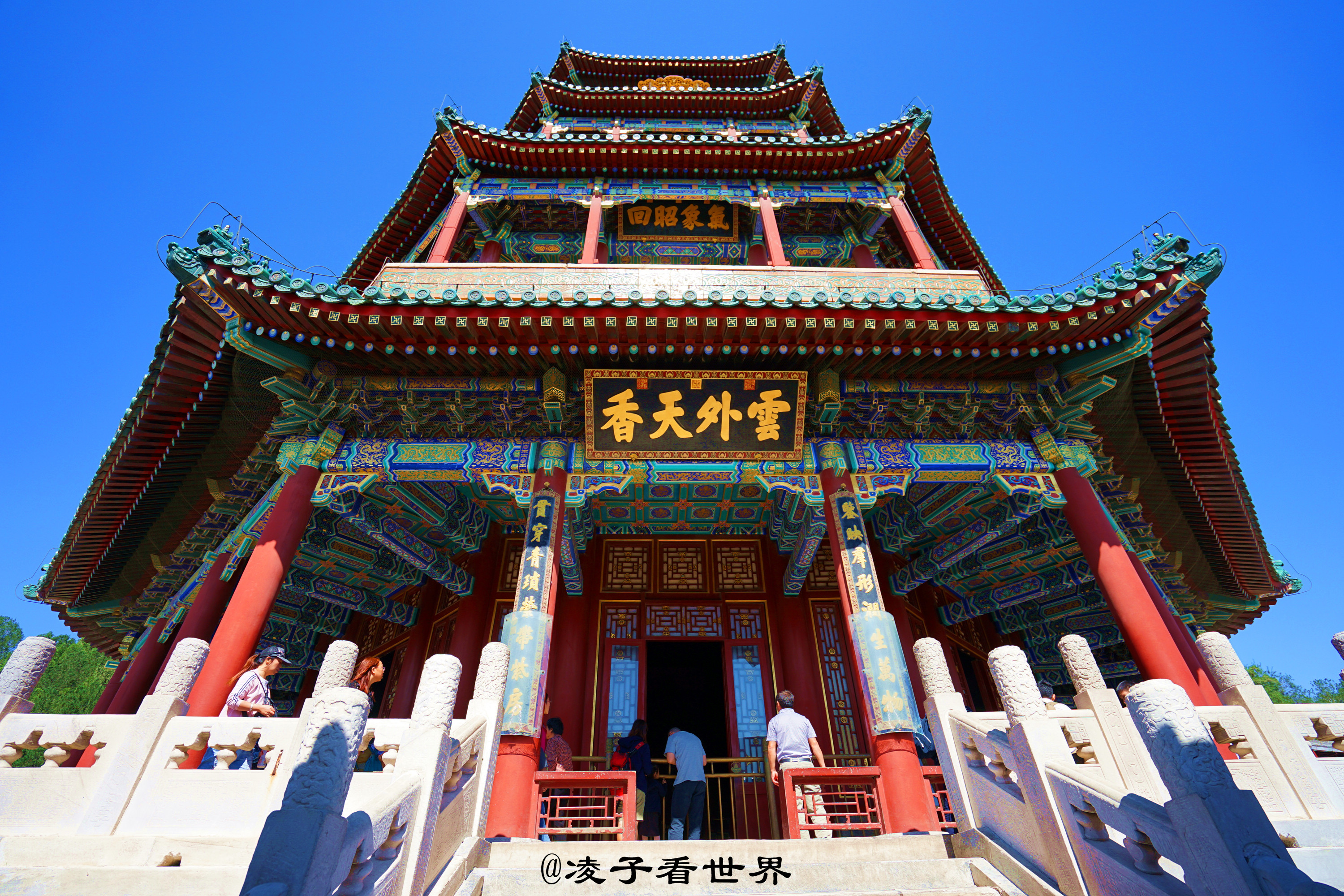 http://si1.go2yd.com/get-image/07ItPiUXugS颐和园佛香阁,阁仗山雄,山因阁秀,万寿山在远处西山群峰的屏嶂和近处玉泉山的陪衬下,小中见大,气势非凡,苍松翠柏,秀色葱茏。佛香阁面对的昆明湖又恰到好处地把这个画面全部倒映出来,山之葱茏,水之澄碧,天光接引,令人荡气回肠。