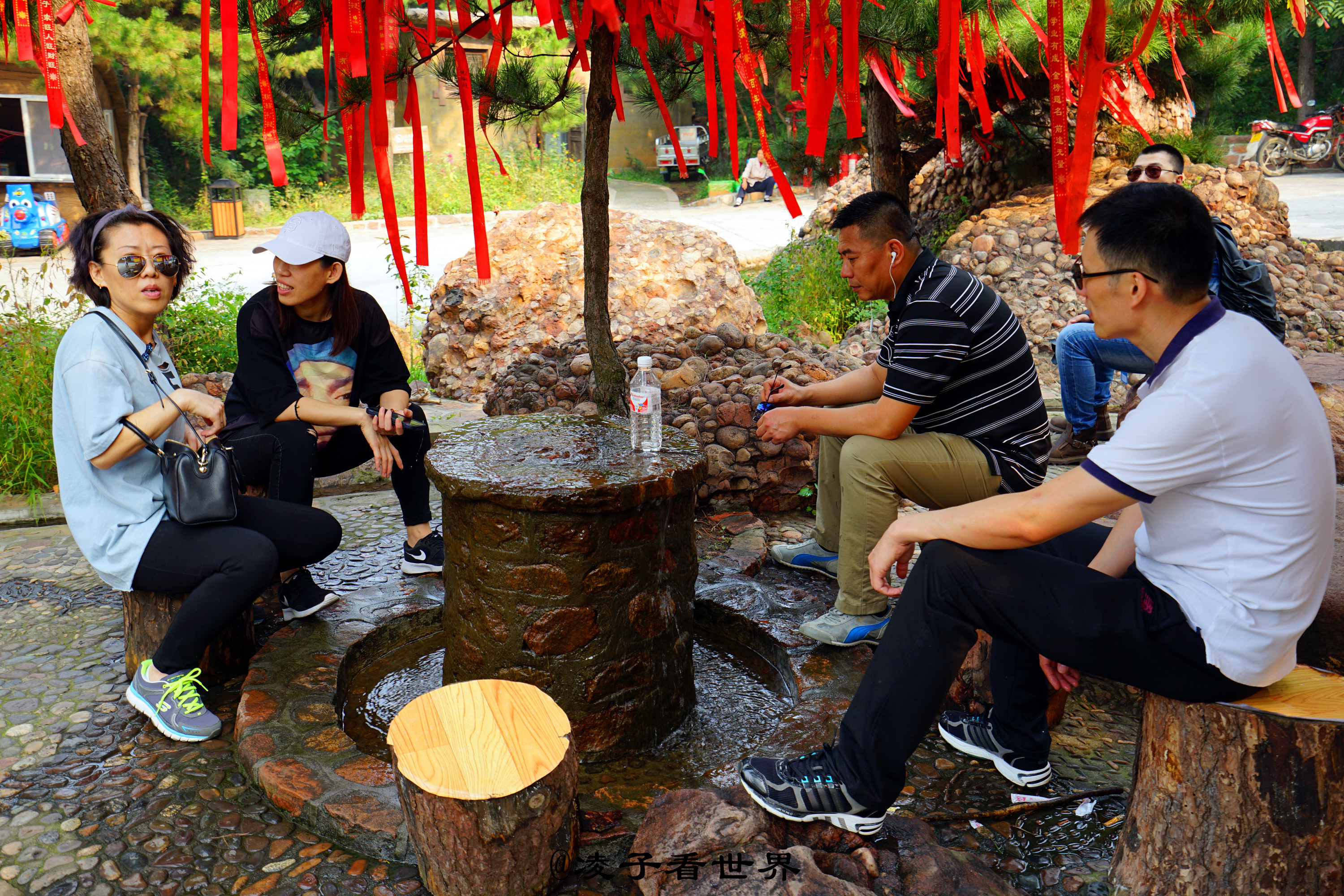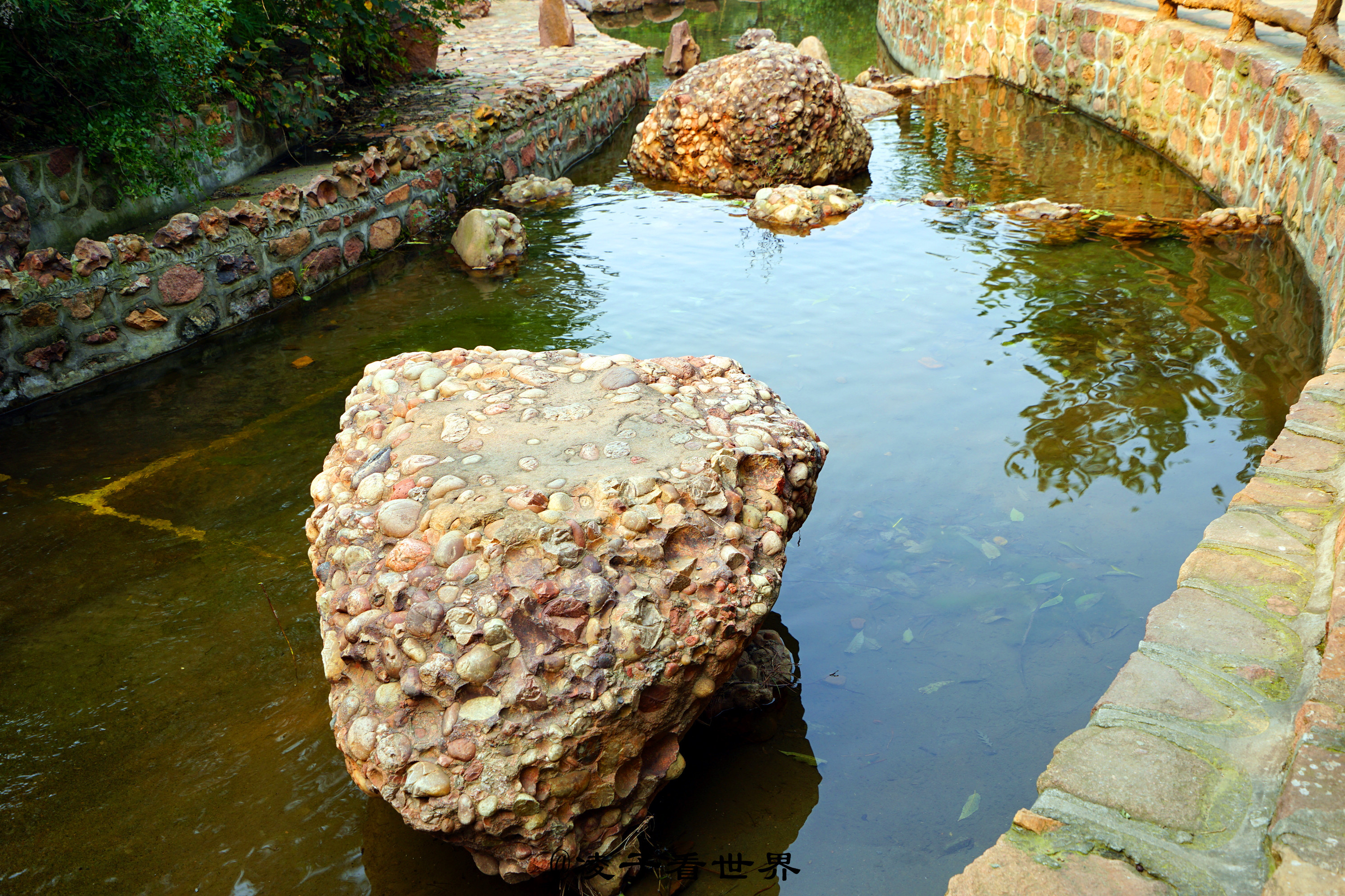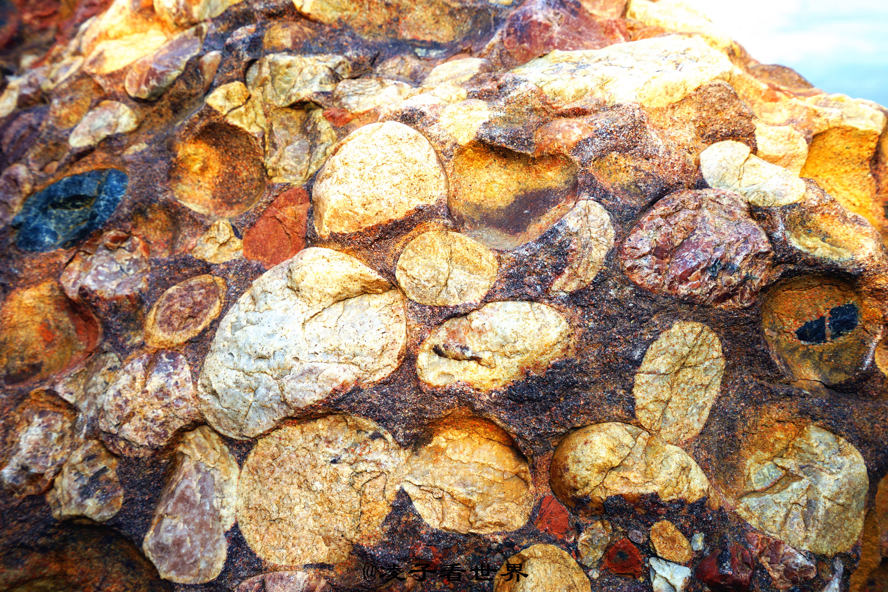 它形象生动逼真,独存一眼、断尾而立。它的旁边是一眼不间断的清泉,昼夜不停的流淌着甘甜的泉水。看着泉水里满眼的彩色石头,仿佛看到了亿万年前这里湛蓝的海水,到处游弋着五彩斑斓的鱼儿。山坡上高大的观音像,时刻护佑着这个亿万年前的生灵。http://si1.go2yd.com/get-image/07LqSuVa4Dw草丛间的石头像是在诉说它的不幸,又像是在诉说它的历史。能这样完整留下来给如今的我们看,看到它们曾经的辉煌,曾经的桑海沧田。很惊奇它们居然能这样紧紧地拥抱在一起,这样的不离不弃。不知经过多少年的磨难,多少年的风雨洗礼,才如此顽强的留下来。经地质专家考证,这里遍地的五彩石是38.5亿年前远古海底的鹅卵石、泥沙在高温高压下,又经过地壳运动形成,有“海底五彩琥珀”的美称。
