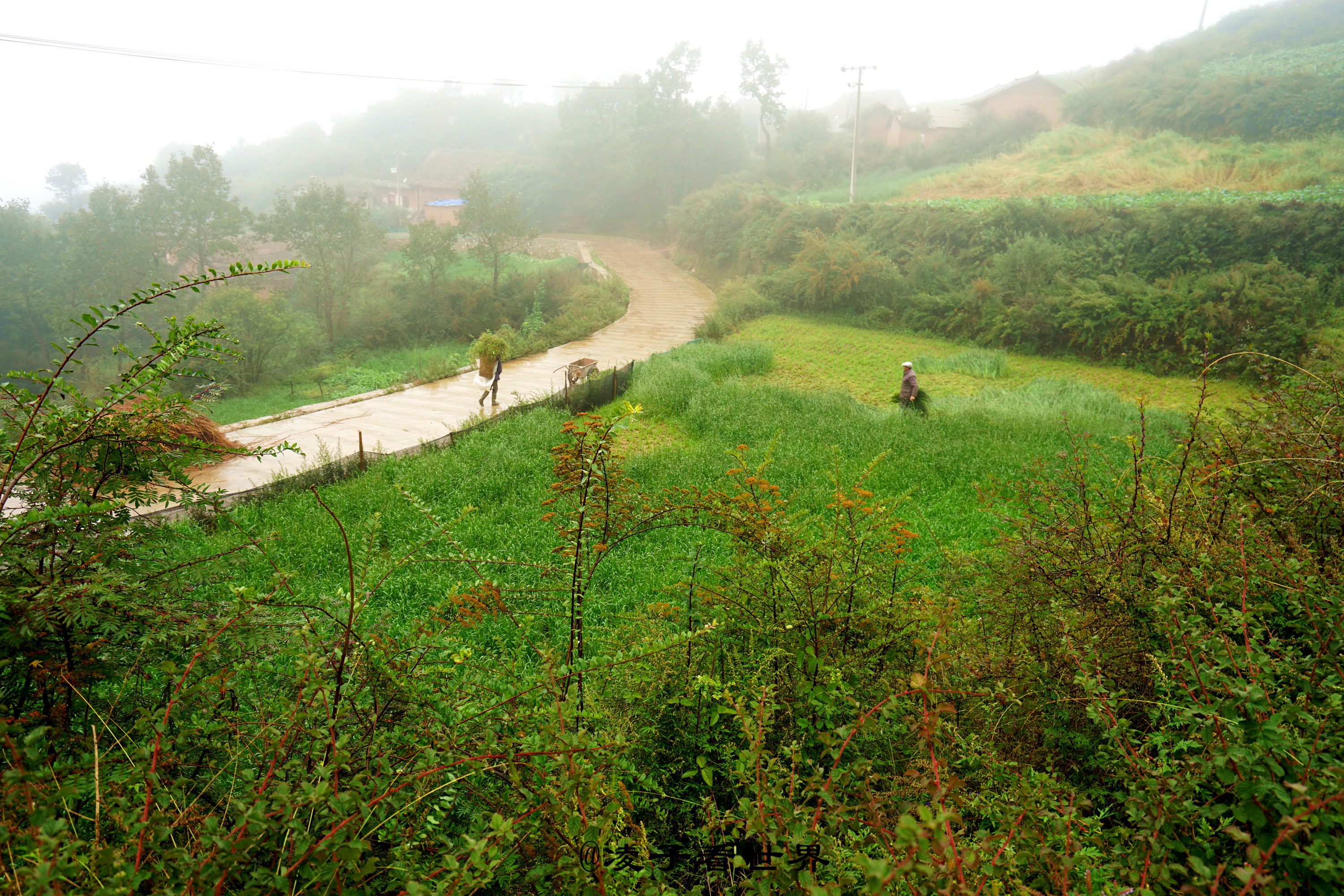 只有在乡村的土地上,方能看出秋雨的神韵,登上后面的小山坡,看到有人在田间劳作。山间小路上背草的人往家走去,不时停下来和田间劳作的邻居寒暄几句。