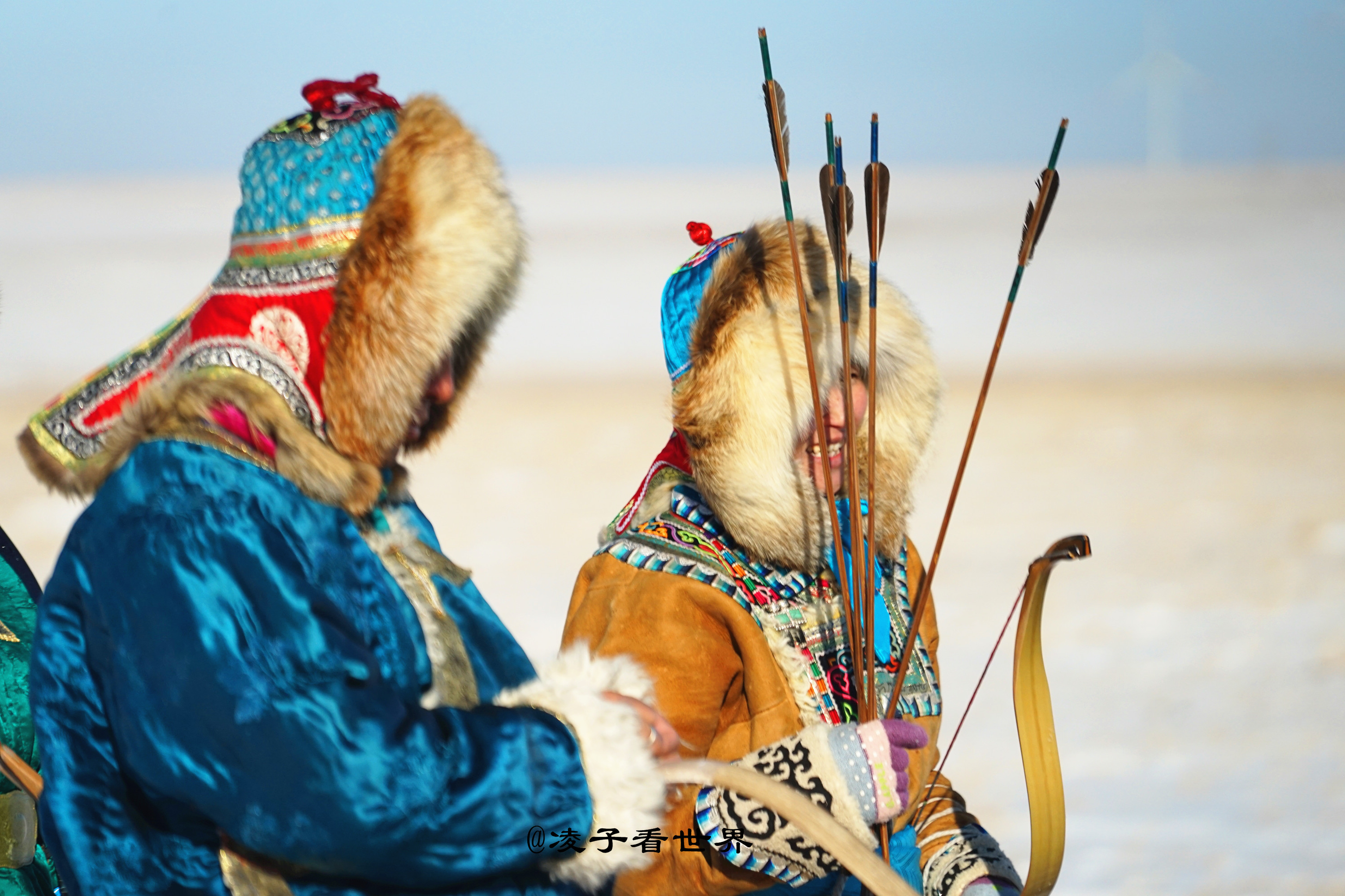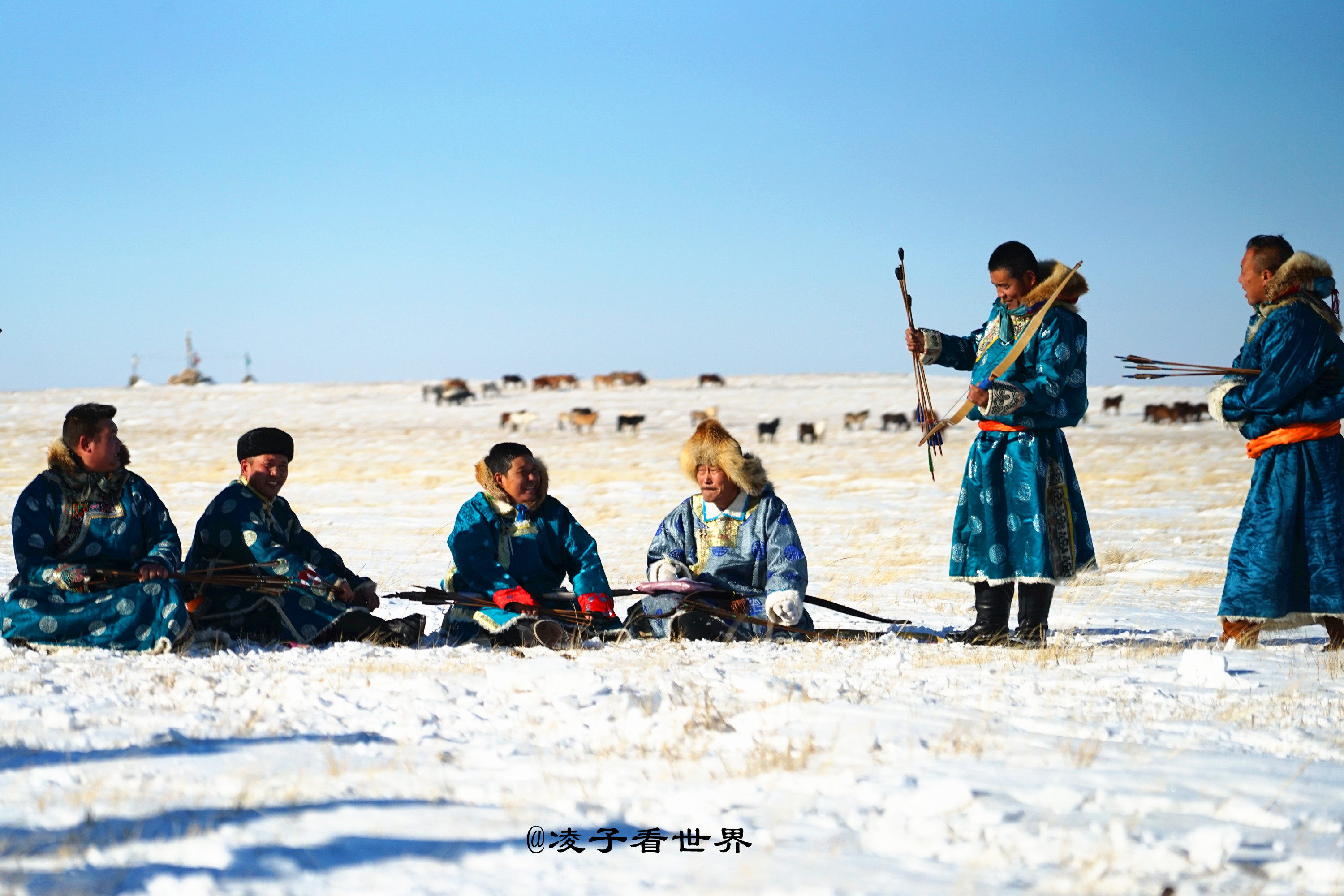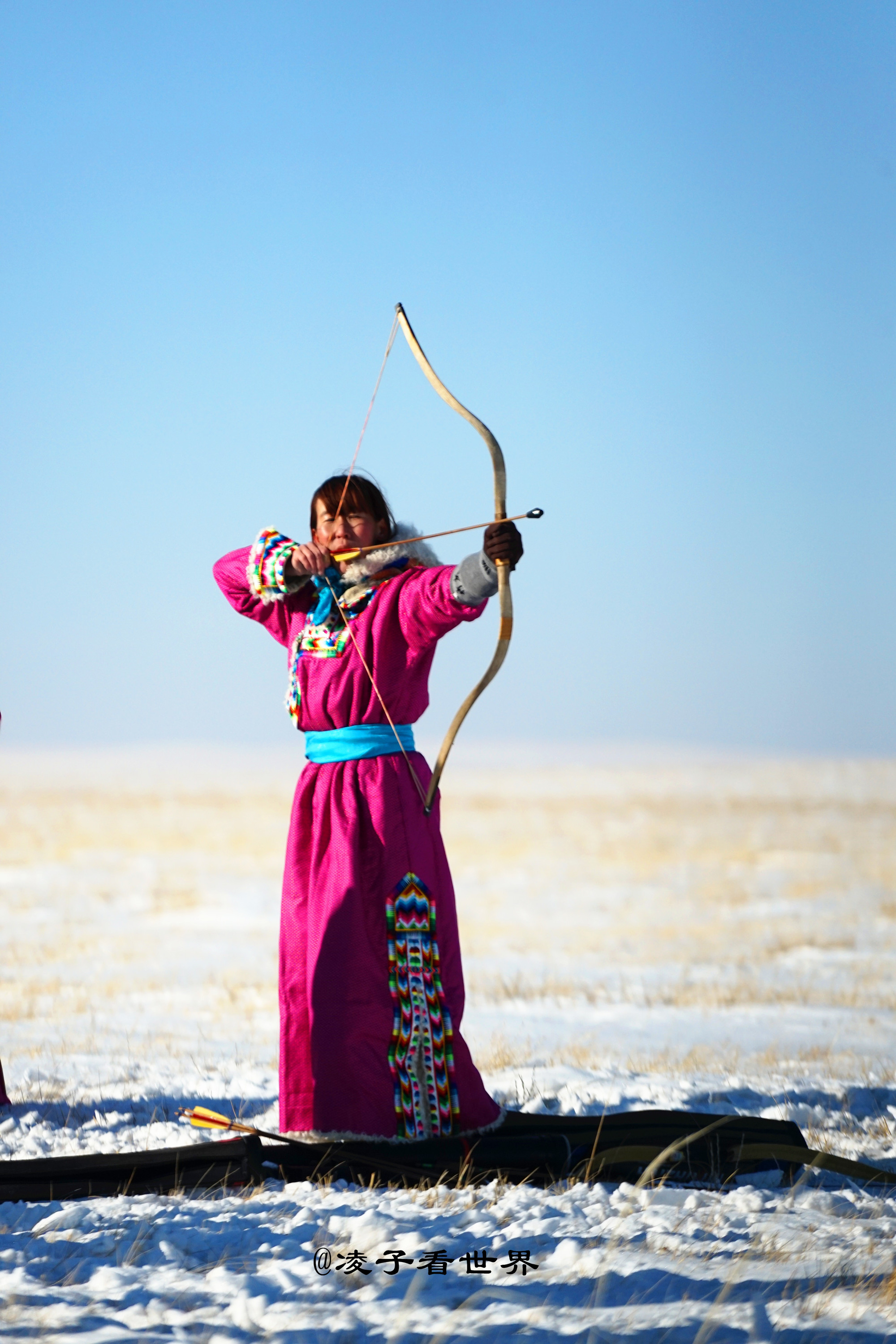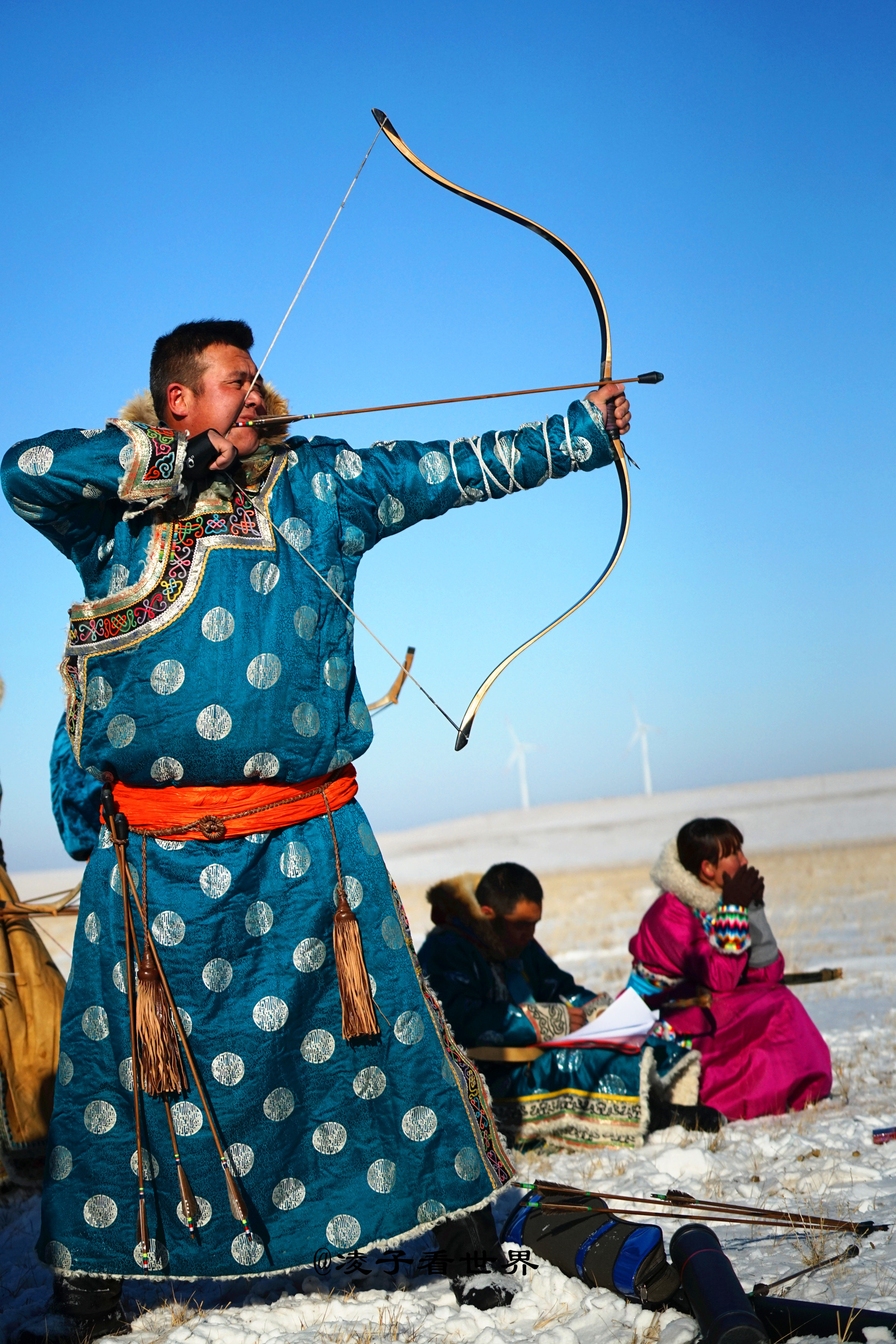 只见雪地里拉弓射箭的女人身着鲜艳的蒙古族盛装,拉起满月弓也是英姿飒爽,巾帼不然须眉啊,很轻松的就把箭射向靶心。男人也是盛装出席,一个个威猛高大。这次他们玩的射箭靶心是活动的,箭中靶心会自动掉下来。射箭也是蒙古族最擅长的,以前游牧民族以放牧和游猎为经济来源,所以这项技能也就流传了下来,射箭比赛不分男女老少,参赛者自备马匹和弓箭,弓箭的样式,弓的拉力以及箭的长度和重量均无限制。比赛的规则是三轮九箭,即每人每轮只许射三支箭,以三次合计中靶次数最多的依次评出前三名。