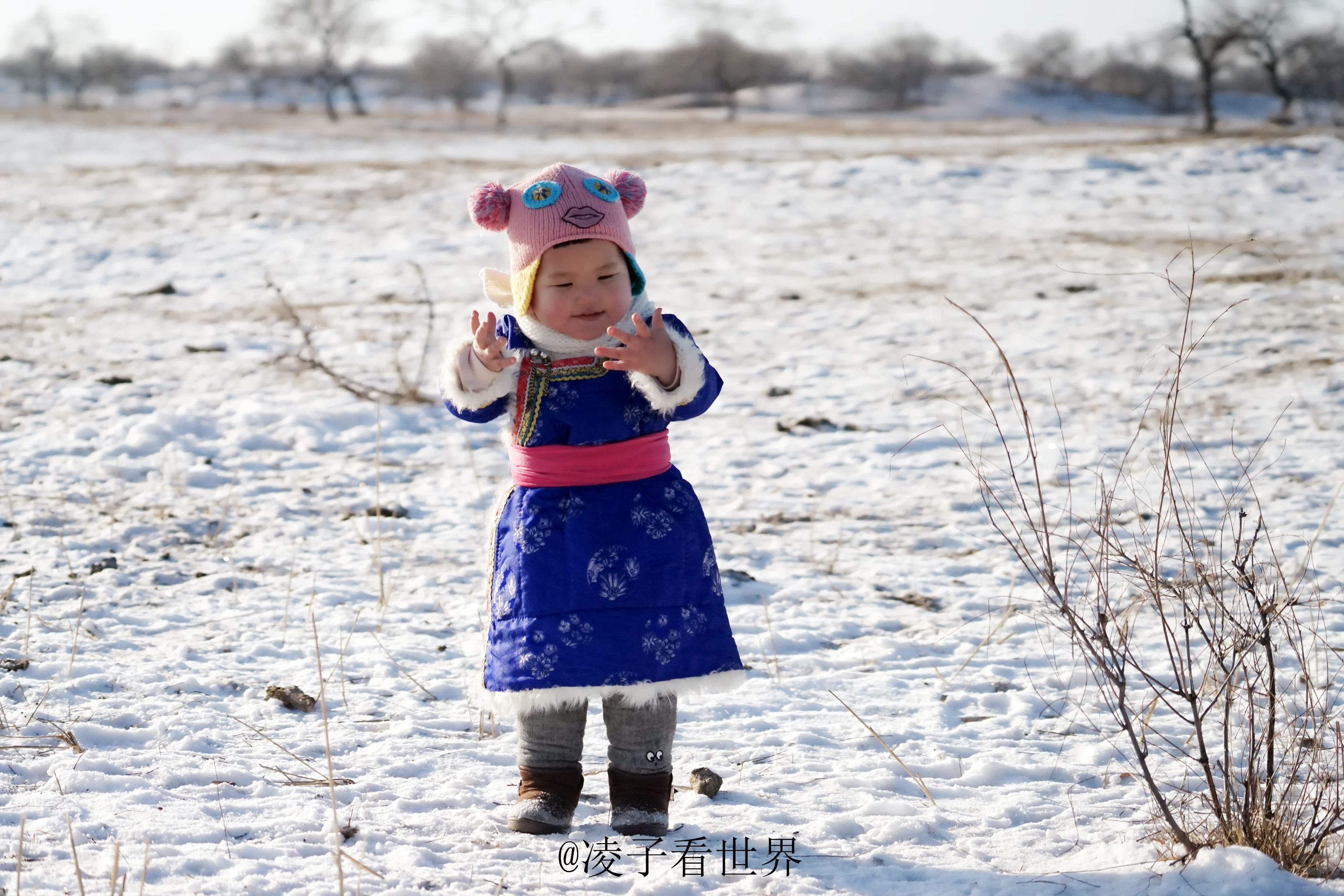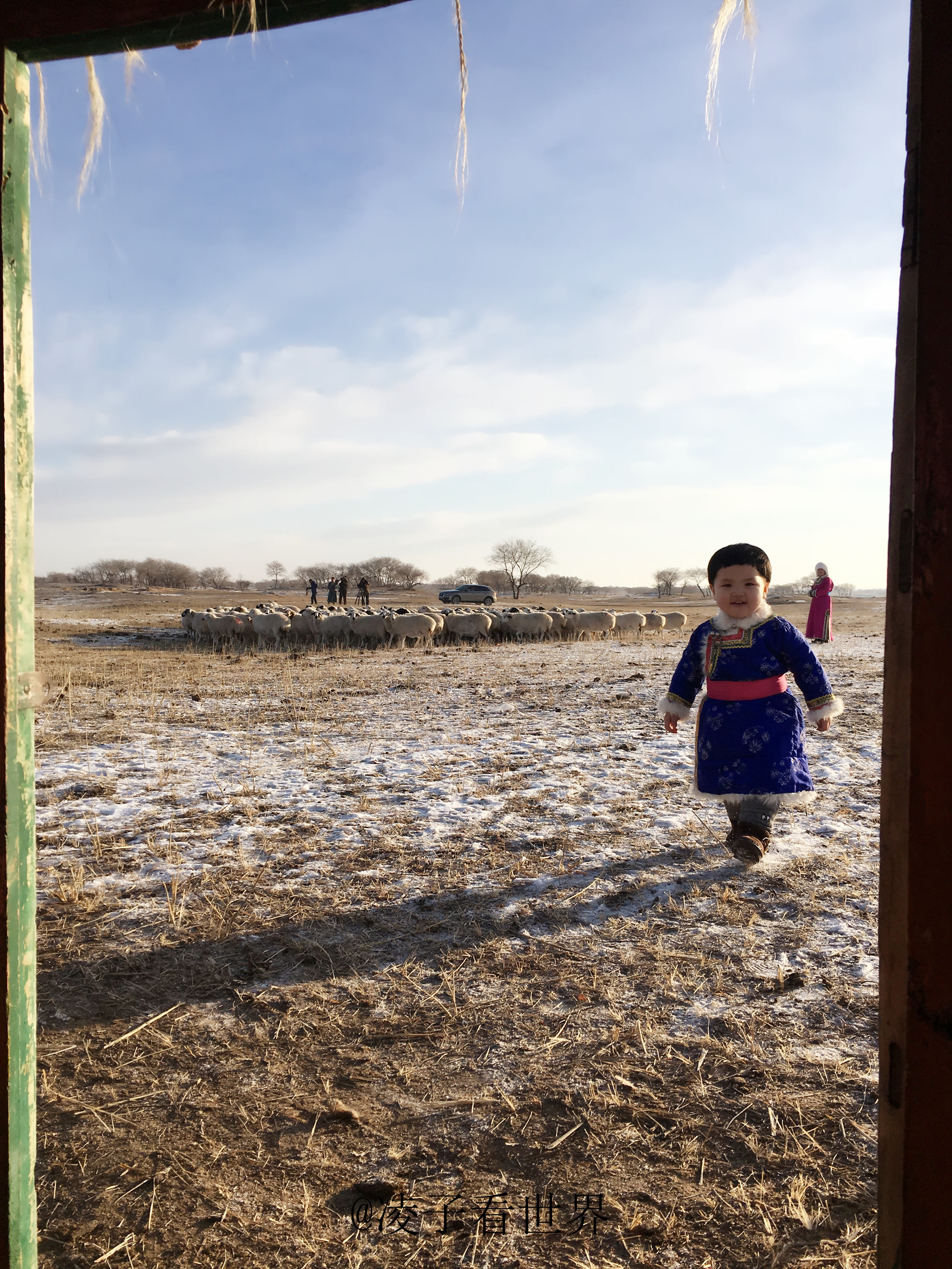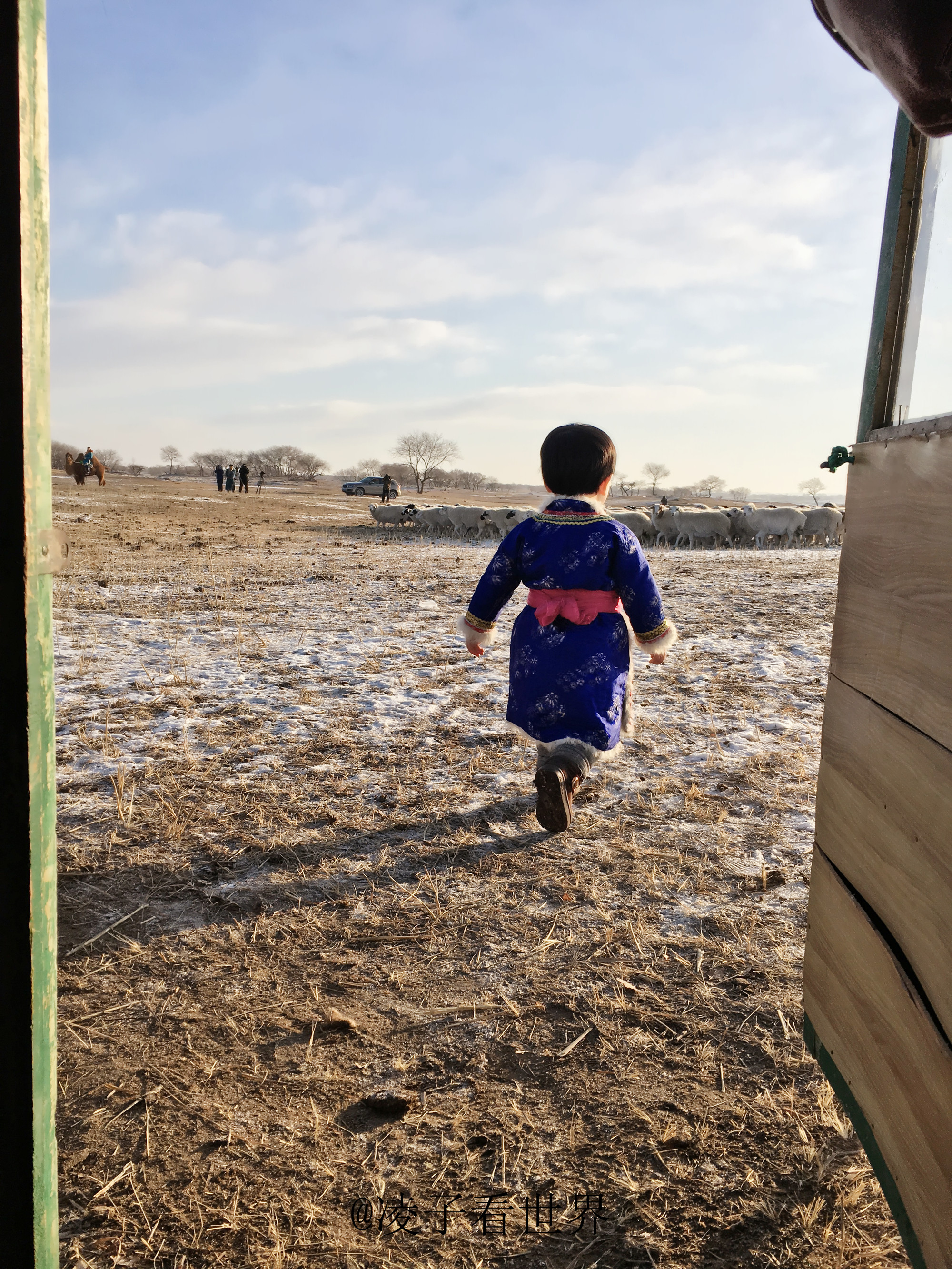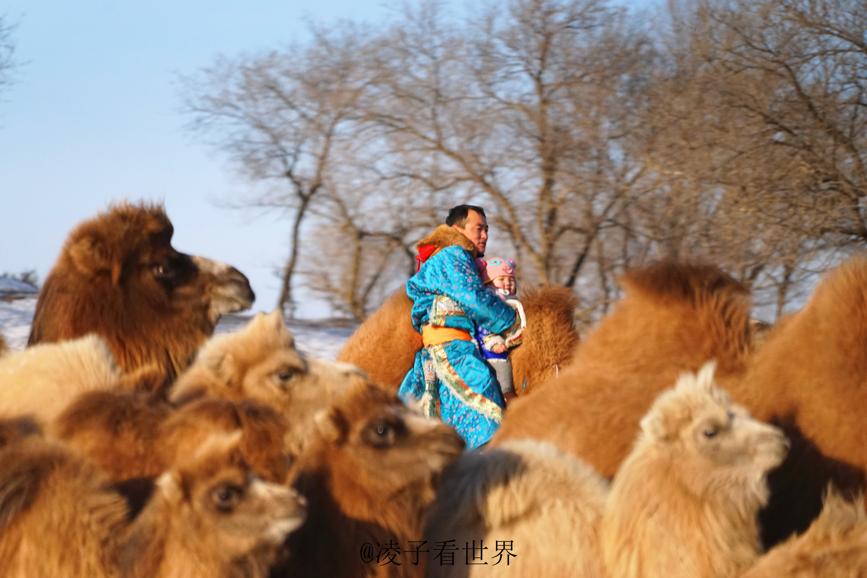 锡林郭勒零下十几度还是可以接受的,看远处姗姗而来的娃娃,从小就不怕冷,一大早就出来陪爸爸妈妈一起牧羊。小脸冻得通红,一点也没有影响她在雪地撒欢的乐趣,一会揪棵草,一会又去骑骆驼,反正是一点都不闲着。