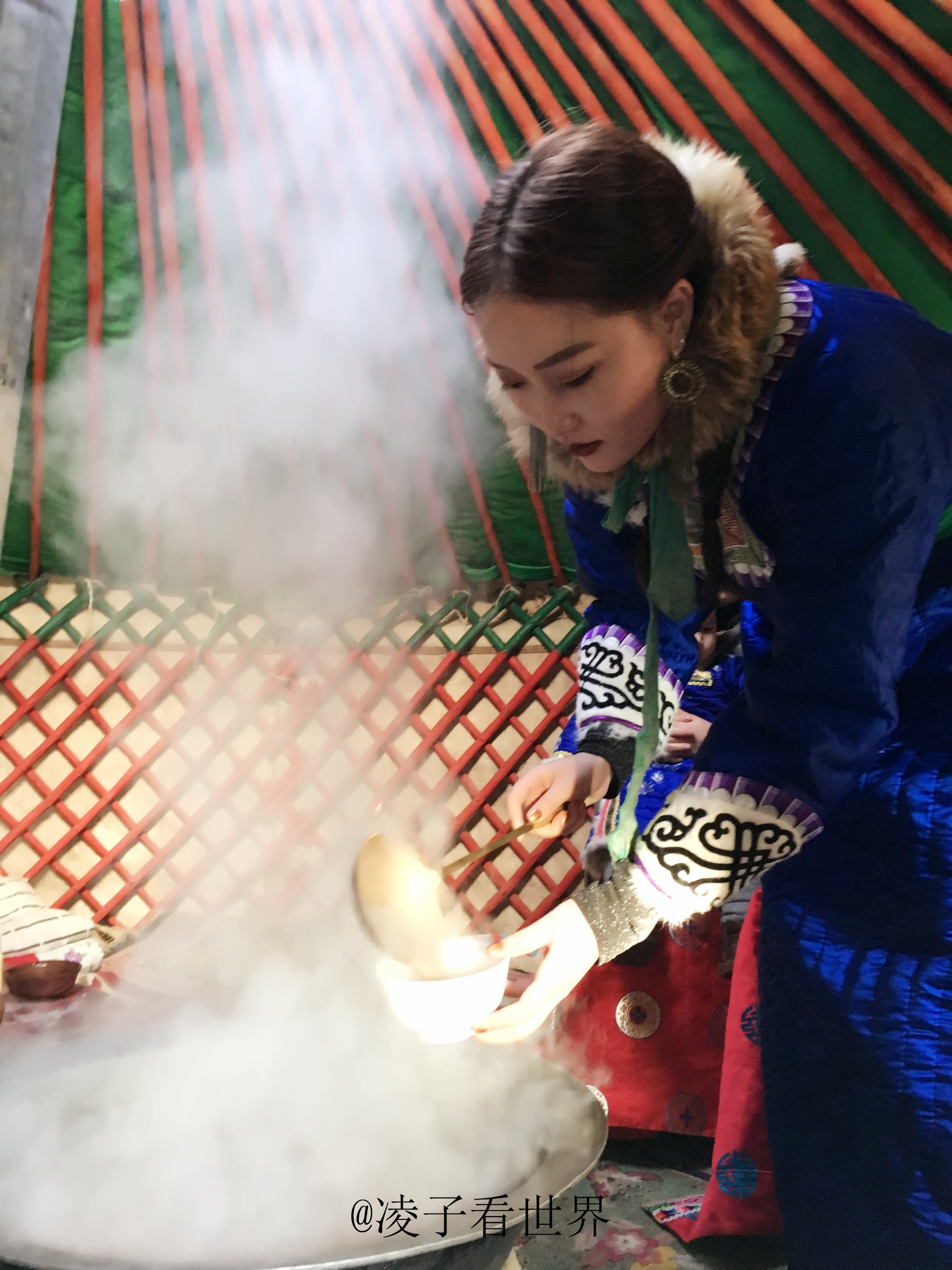 勤劳的蒙古族女主人一大早就要开始挤牛奶,放牧牛羊,烧水,煮奶茶。水烧开后放上砖茶,等水翻腾着熬几次之后,过滤掉茶叶末,然后倒入新鲜的牛奶熬开就可以喝了。喝的时候可以加盐也可以加糖,一般他们喝都是放盐。这时的奶茶喝起来奶香浓郁,入口绵柔,回味悠长,越喝越香,再加上炒米又是另一种味道,既有奶香又有炒米的米香,很受大家欢迎。她们自己做的奶酪香醇滑口,入口即化,超级的好吃,我是不停的吃了好几块。