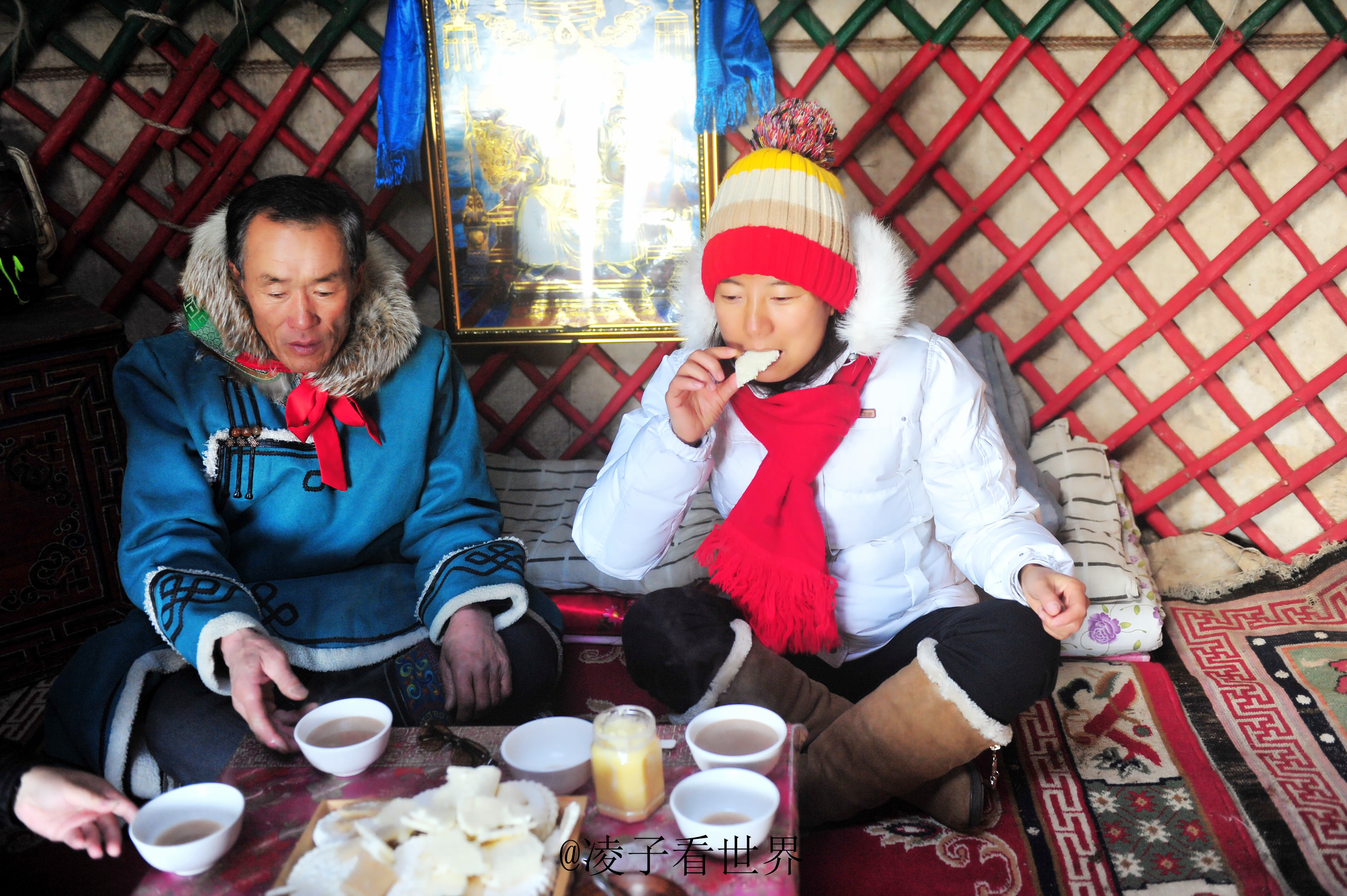 一来我们就在草原和骆驼玩耍,呆的久了,还真是有点冷。进蒙古包喝奶茶吧,热情的一家人早早的就生起火炉,开始为远道而来的客人准备奶茶。一进去浓郁的茶香就扑面而来,美丽的蒙族姑娘热情为大家盛上热乎乎的奶茶,小桌上摆满了奶酪,奶豆腐,粿条,都是他们亲手制作的。喝奶茶一定要放炒米,黄油。这些都是他们招待贵宾时才会吃得这般丰盛,平时他们可能也就喝茶吃个饼什么的。