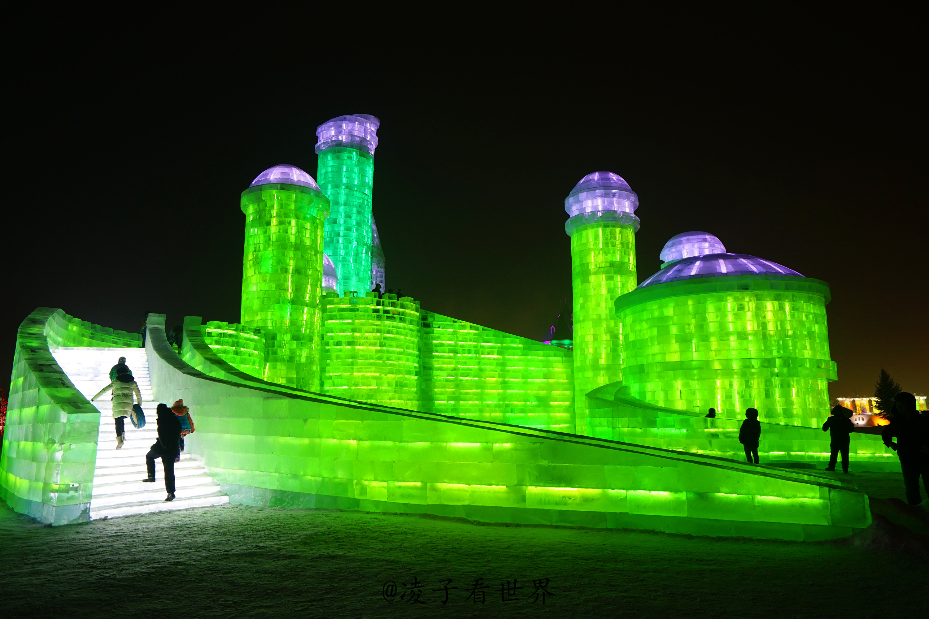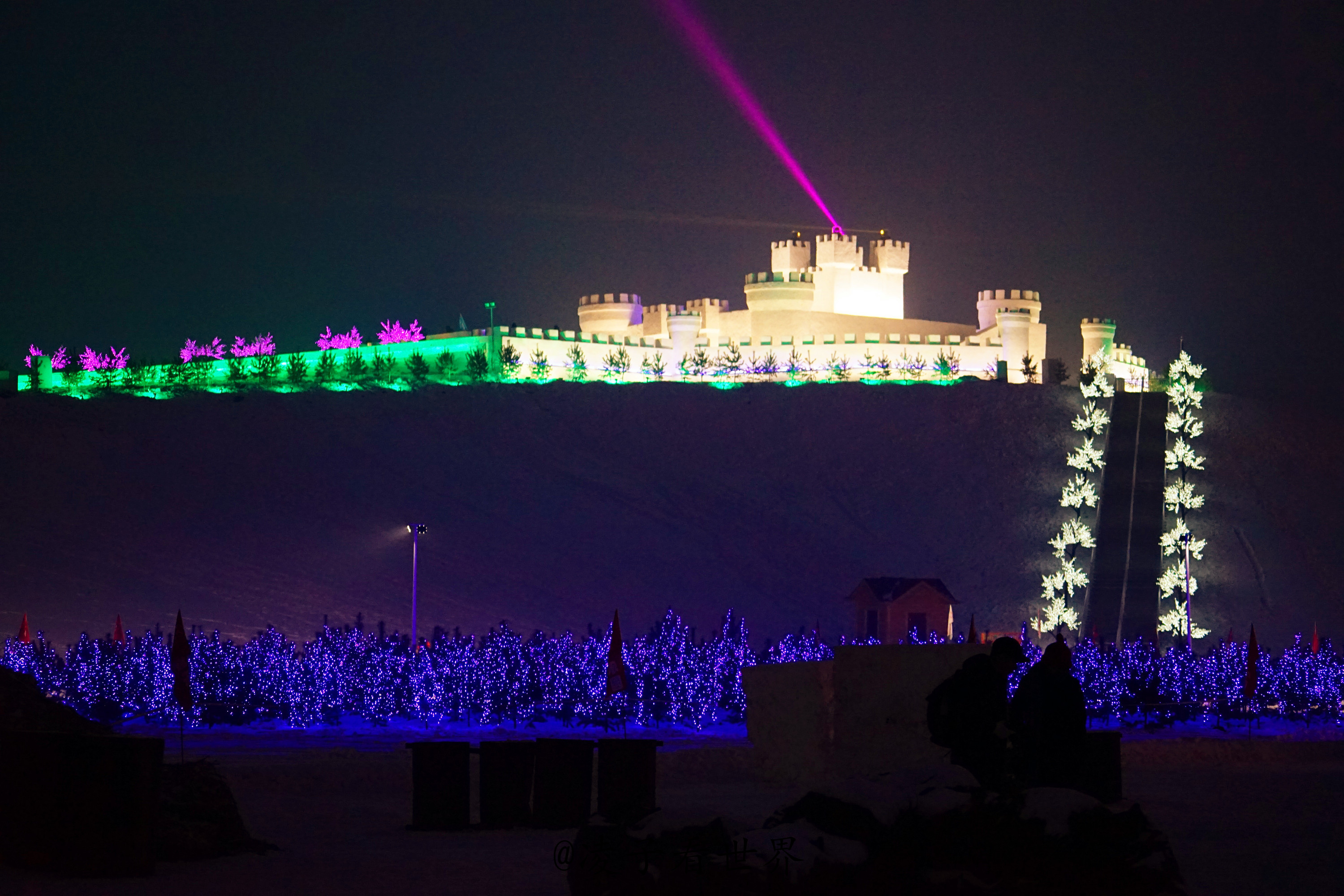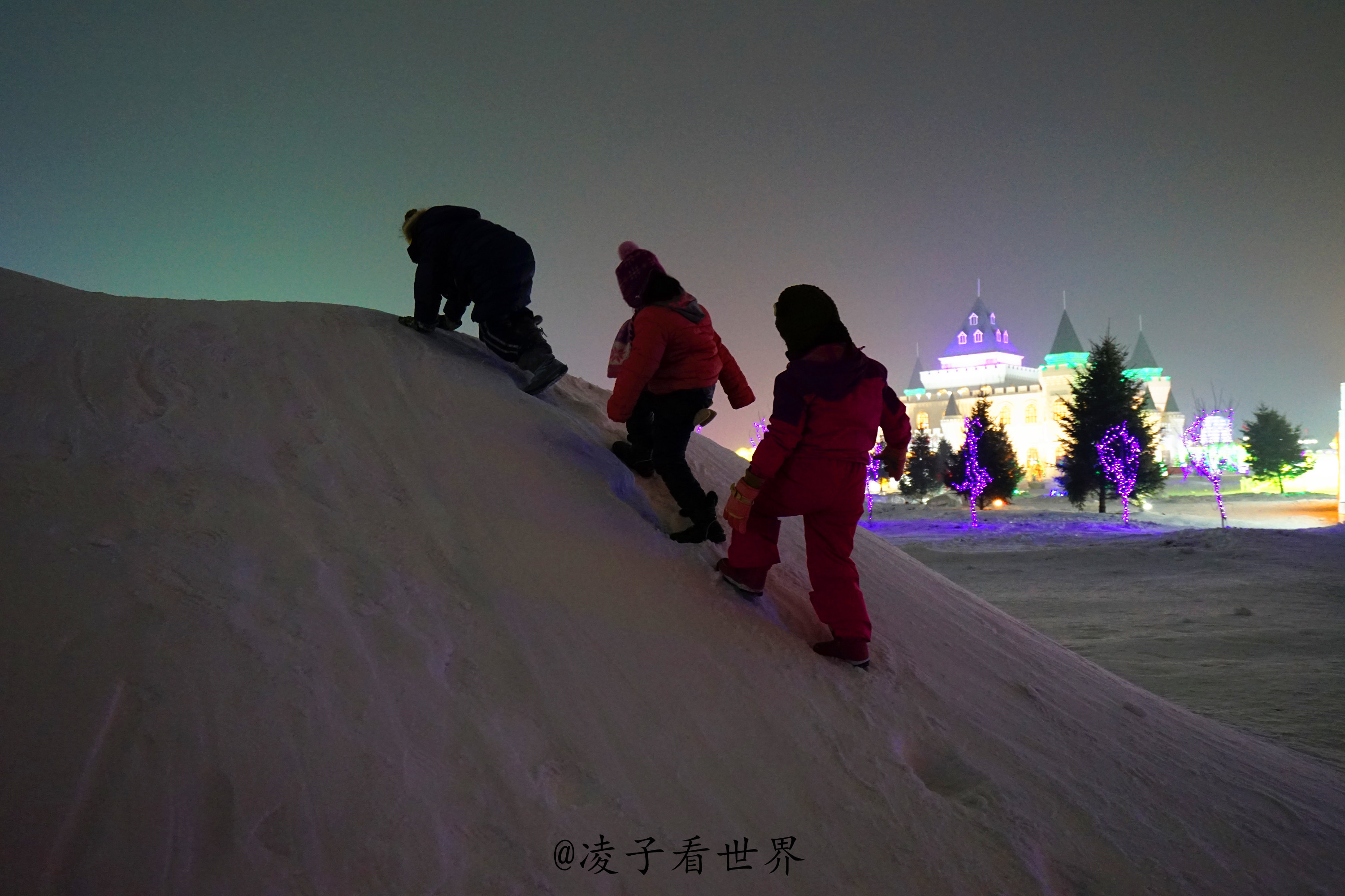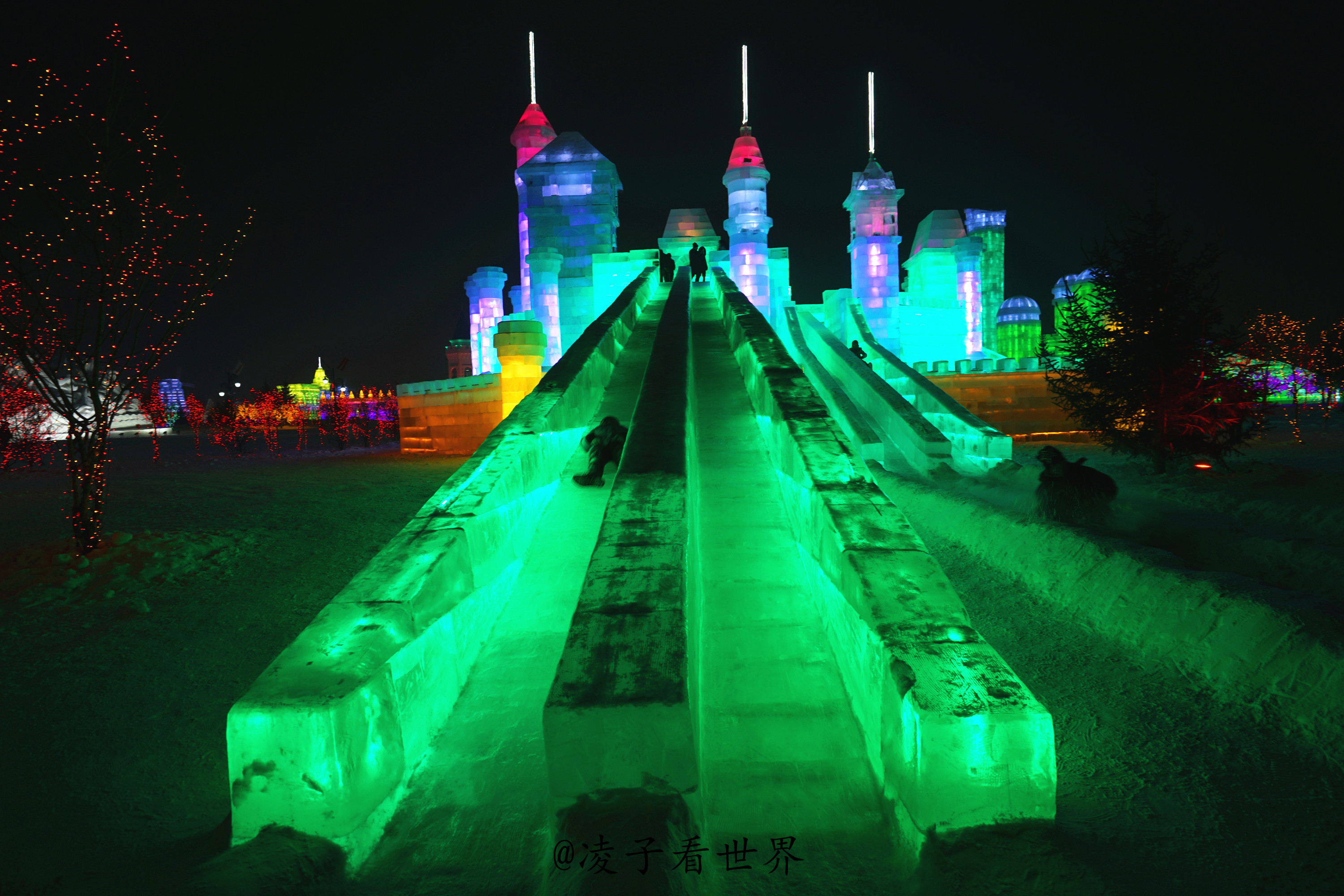 夜晚的星座城堡被五颜六色的彩灯装点的五彩缤纷,夜晚的冰雕如一座座晶莹剔透的魔幻城堡犹如穿越到未来世界。孩子们最喜欢的莫过于这里的冰滑梯,由于穿的很多,坐上去一点都不凉屁股,看到没有,聪明的孩子都是自己随身带一个纸板,一看就是经常来玩的,很有经验的。这里有一个最大最高最长的冰滑梯,全长八百米,滑下去的感觉简直是耳边生风,速度极快,如果你够勇敢就来挑战吧。来到这里大人小孩都是欢乐的,大人甚至比孩子们玩的更来劲。感觉几十年都没有这样痛快的玩耍过。站在这里可以一览冰雕乐园的全貌,放眼望去,灯火辉煌,精彩纷呈。