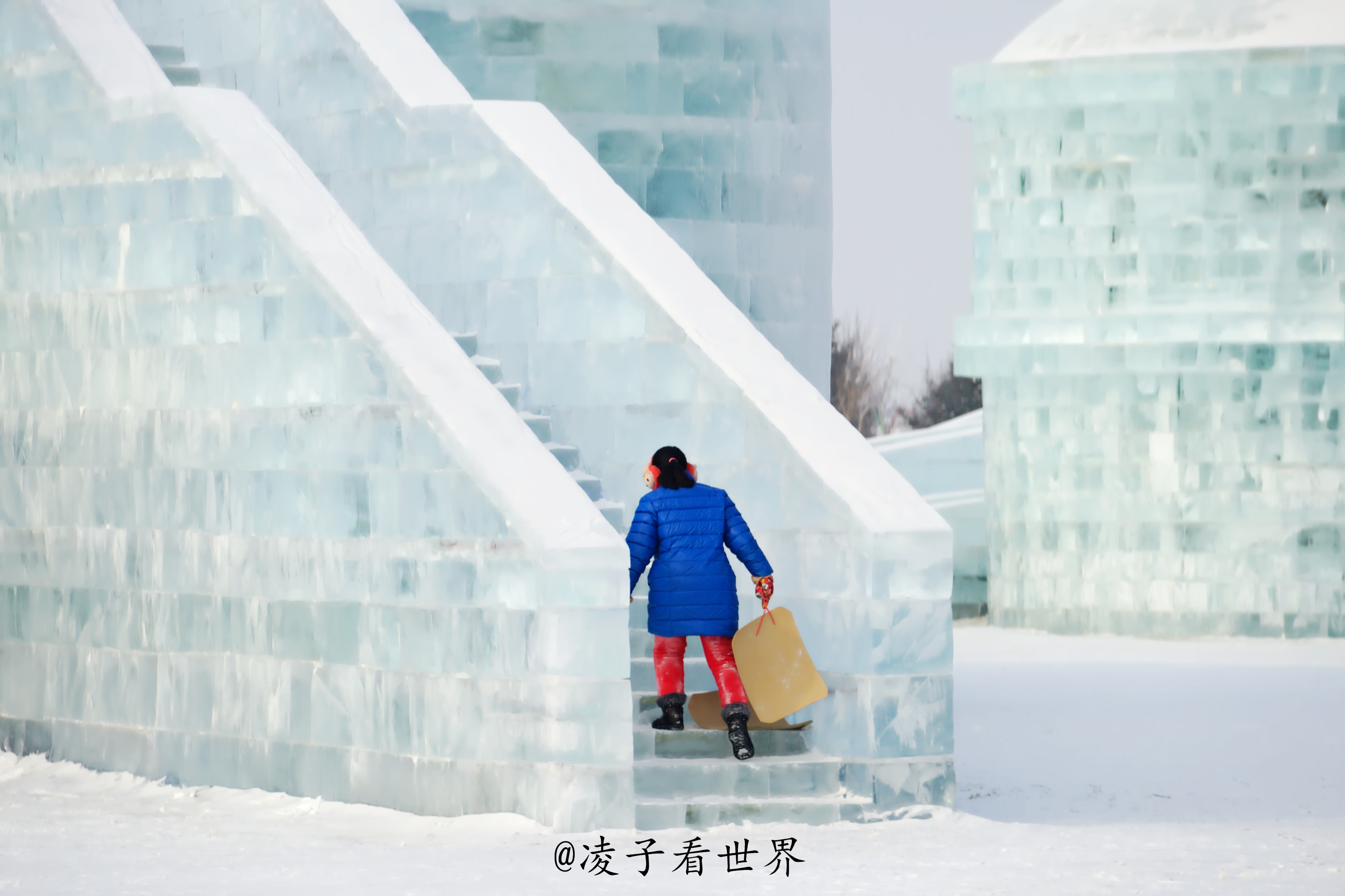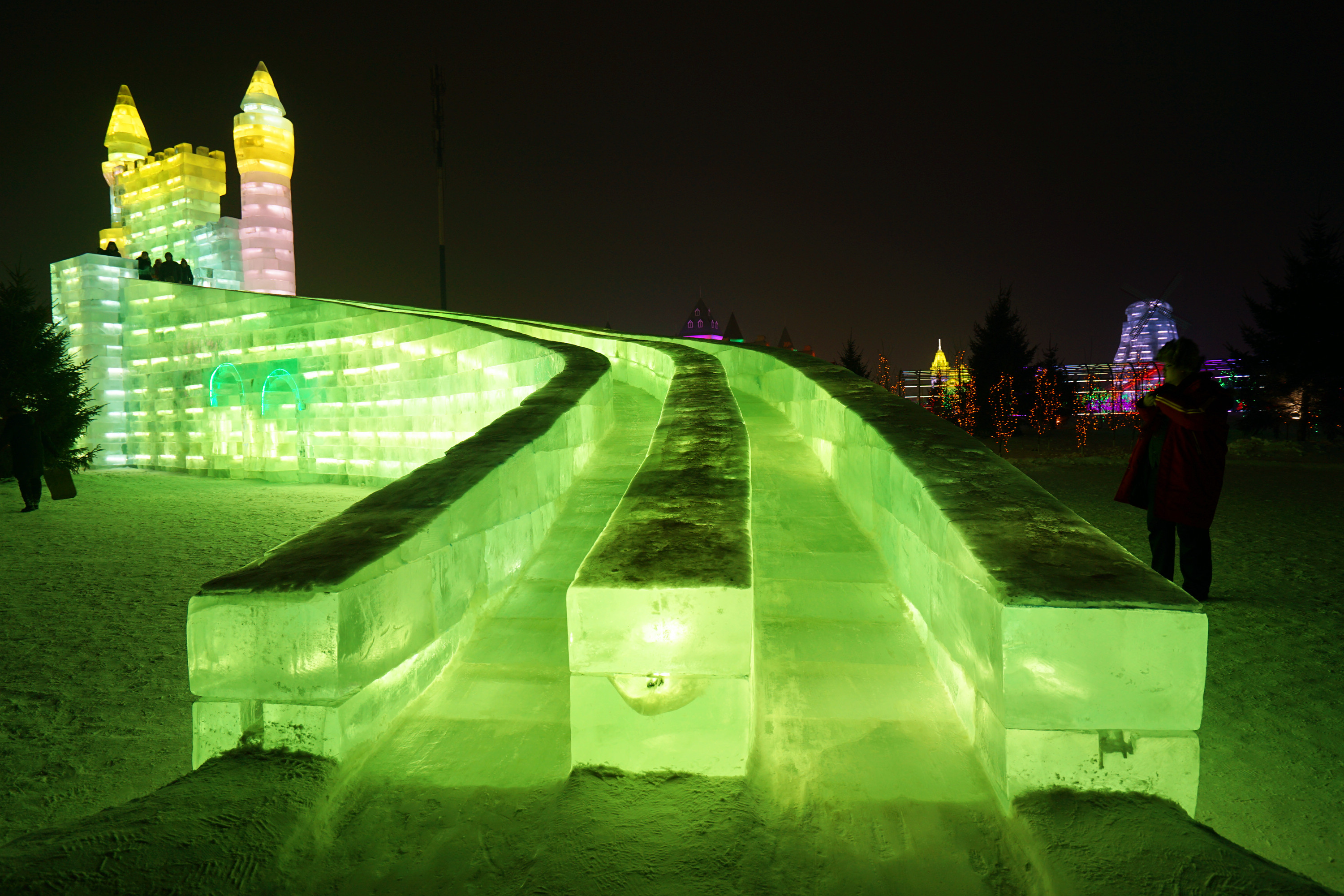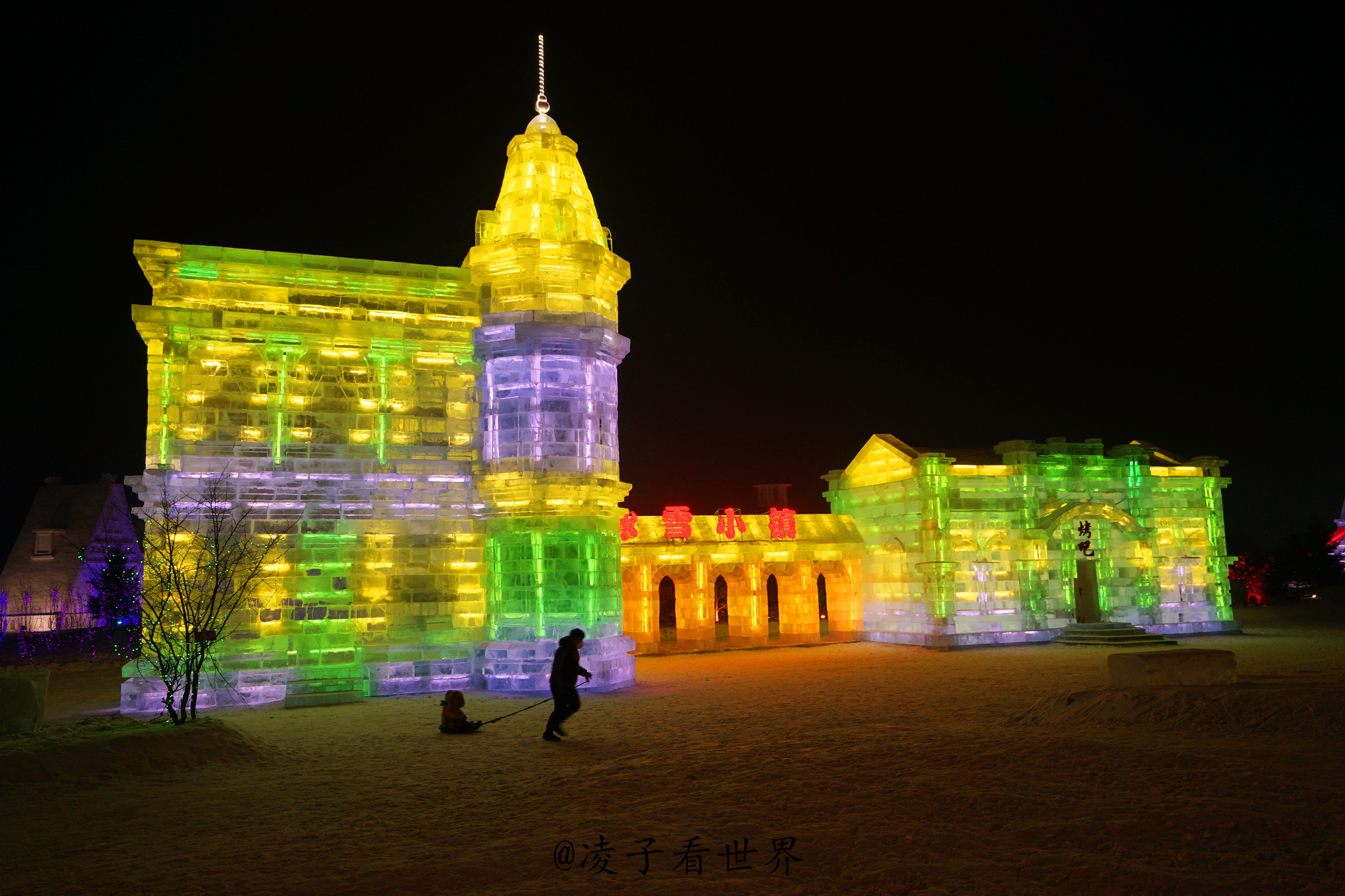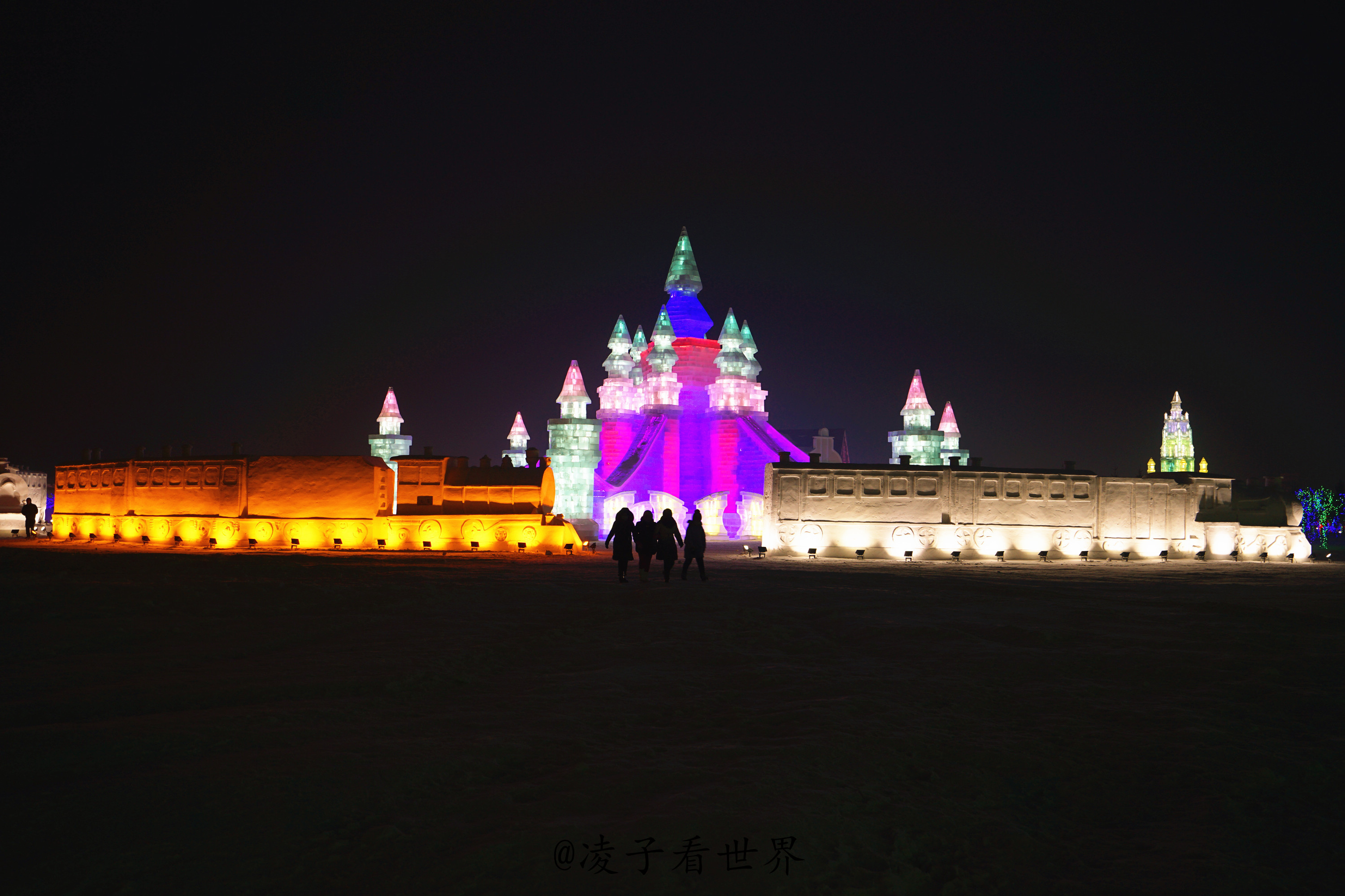 夜晚的星座城堡被五颜六色的彩灯装点的五彩缤纷,夜晚的冰雕如一座座晶莹剔透的魔幻城堡犹如穿越到未来世界。孩子们最喜欢的莫过于这里的冰滑梯,由于穿的很多,坐上去一点都不凉屁股,看到没有,聪明的孩子都是自己随身带一个纸板,一看就是经常来玩的,很有经验的。这里有一个最大最高最长的冰滑梯,全长八百米,滑下去的感觉简直是耳边生风,速度极快,如果你够勇敢就来挑战吧。来到这里大人小孩都是欢乐的,大人甚至比孩子们玩的更来劲。感觉几十年都没有这样痛快的玩耍过。站在这里可以一览冰雕乐园的全貌,放眼望去,灯火辉煌,精彩纷呈。